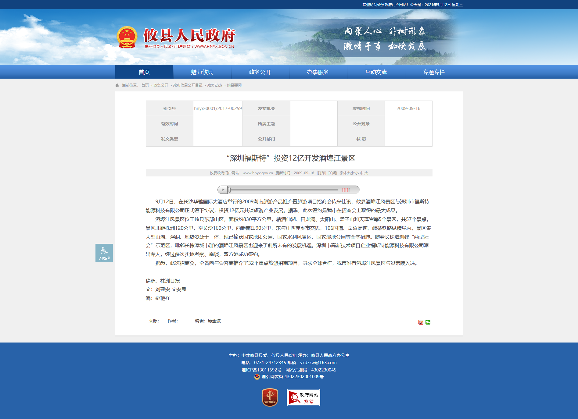 9月12日,在长沙华雅国际大酒店举行的2009湖南旅游产品推介暨旅游项目招商会传来佳讯,攸县酒埠江风景区与深圳市福斯特能源科技有限公司正式签下协议,投资12亿元共谋旅游产业发展。据悉,此次签约是我市在招商会上取得的最大成果。 酒埠江风景区位于攸县东部山区,面积约830平方公里,辖酒仙湖、白龙洞、太阳山、孟子山和天蓬岩等5个景区,共57个景点。景区北距株洲120公里,至长沙160公里,西距南岳90公里,东与江西萍乡市交界,106国道、岳汝高速、醴茶铁路纵横境内。景区集大型山湖、溶洞、地热资源于一体,现已摘获国家地质公园、国家水利风景区、国家湿地公园等金字招牌。随着长株潭创建“两型社会”示范区,毗邻长株潭城市群的酒埠江风景区也迎来了前所未有的发展机遇。深圳市高新技术项目企业福斯特能源科技有限公司派出专人,经过多次实地考察、商谈,双方终成功签约。