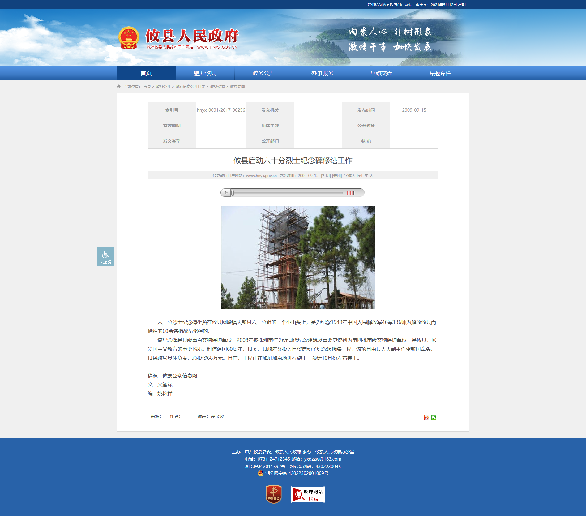 该纪念碑是县级重点文物保护单位,2008年被株洲市作为近现代纪念建筑及重要史迹列为第四批市级文物保护单位,是攸县开展爱国主义教育的重要场所。时值建国60周年,县委、县政府又投入巨资启动了纪念碑修缮工程。该项目由县人大副主任贺新国牵头,县民政局具体负责,总投资68万元。目前,工程正在加班加点地进行施工,预计10月份左右完工。 稿源:攸县公众信息网 文:文智深 编:姚艳祥