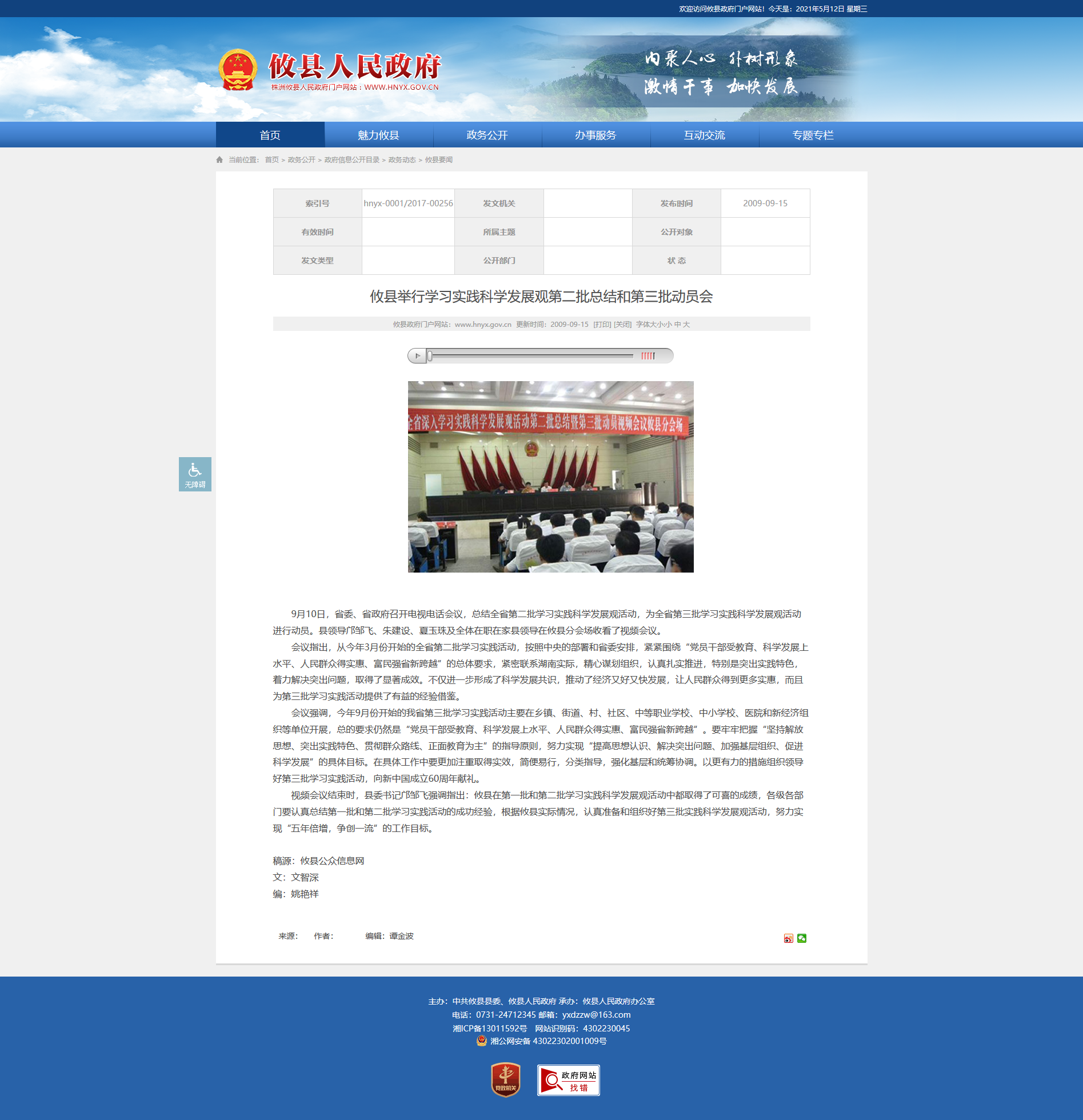 视频会议结束时,县委书记邝邹飞强调指出:攸县在第一批和第二批学习实践科学发展观活动中都取得了可喜的成绩,各级各部门要认真总结第一批和第二批学习实践活动的成功经验,根据攸县实际情况,认真准备和组织好第三批实践科学发展观活动,努力实现“五年倍增,争创一流”的工作目标。 稿源:攸县公众信息网 文:文智深 编:姚艳祥