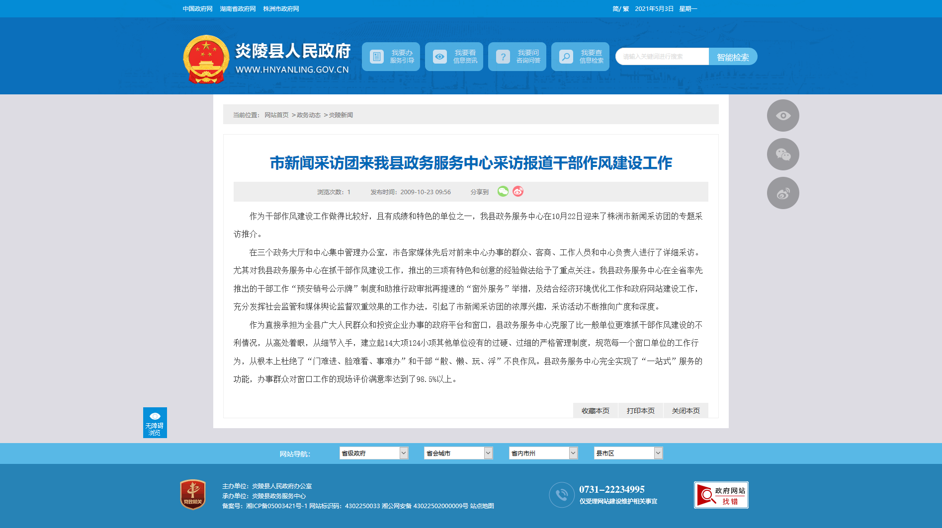 作为直接承担为全县广大人民群众和投资企业办事的政府平台和窗口,县政务服务中心克服了比一般单位更难抓干部作风建设的不利情况,从高处着眼,从细节入手,建立起14大项124小项其他单位没有的过硬、过细的严格管理制度,规范每一个窗口单位的工作行为,从根本上杜绝了“门难进、脸难看、事难办”和干部“散、懒、玩、浮”不良作风。县政务服务中心完全实现了“一站式”服务的功能,办事群众对窗口工作的现场评价满意率达到了98.5%以上。