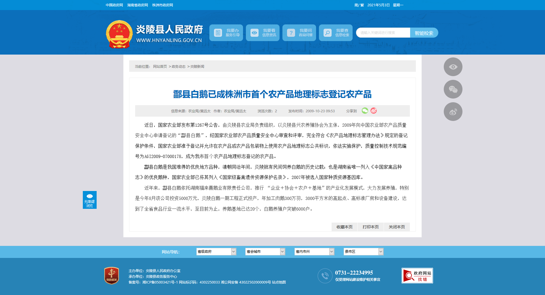 近日,国家农业部发布第1267号公告,由炎陵县农业局负责组织,以炎陵县兴农养殖协会为主体,2009年向中国农业部农产品质量安全中心申请登记的“酃县白鹅”,经国家农业部农产品质量安全中心审查和评审,完全符合《农产品地理标志管理办法》规定的登记保护条件,国家农业部准予登记并允许在农产品或农产品包装物上使用农产品地理标志公共标识,依法实施保护,质量控制技术规范编号为AGI2009-07000178,成为我市首个农产品地理标志登记的农产品。