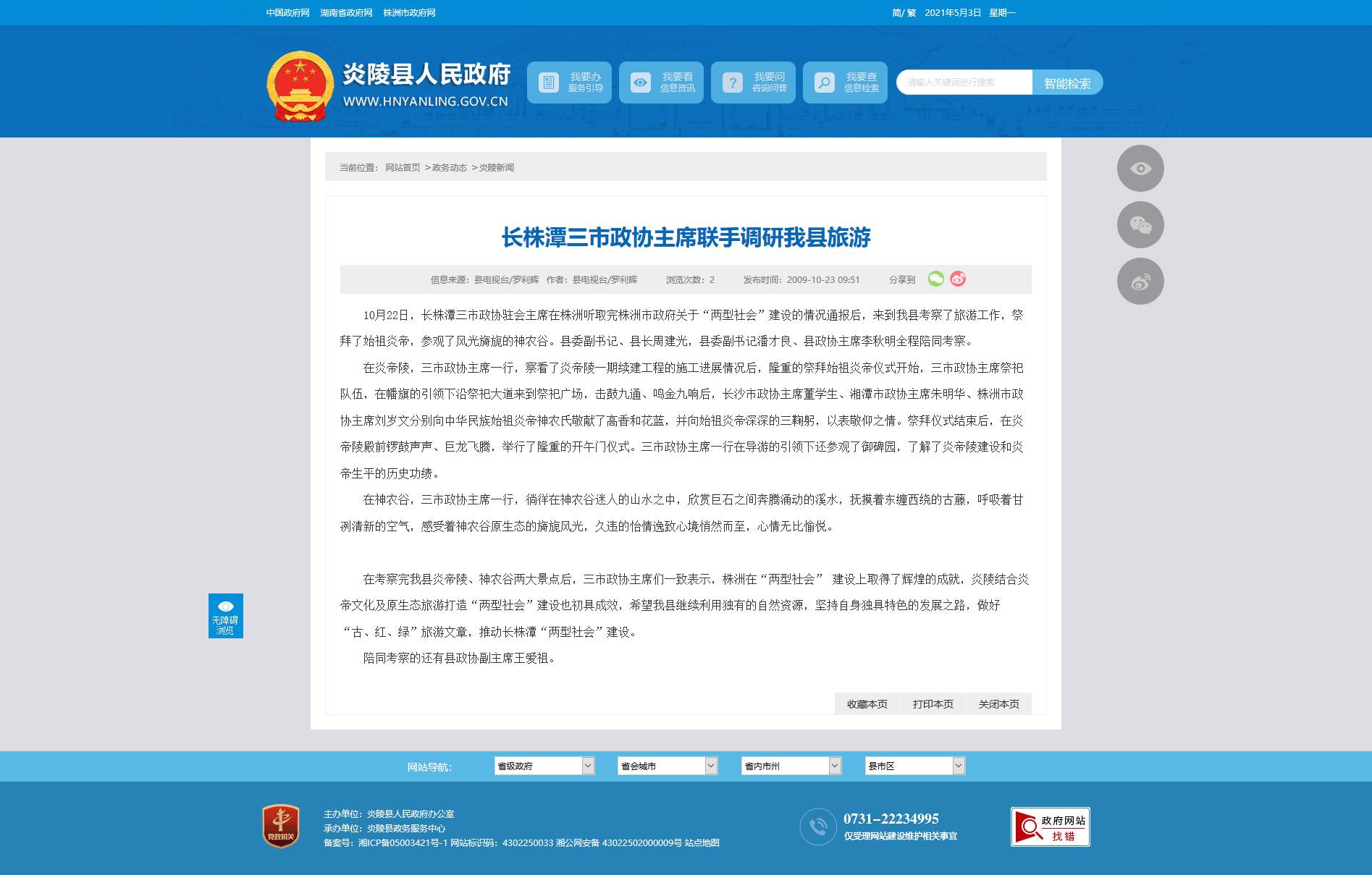 在考察完我县炎帝陵、神农谷两大景点后,三市政协主席们一致表示,株洲在“两型社会” 建设上取得了辉煌的成就,炎陵结合炎帝文化及原生态旅游打造“两型社会”建设也初具成效,希望我县继续利用独有的自然资源,坚持自身独具特色的发展之路,做好“古、红、绿”旅游文章,推动长株潭“两型社会”建设。