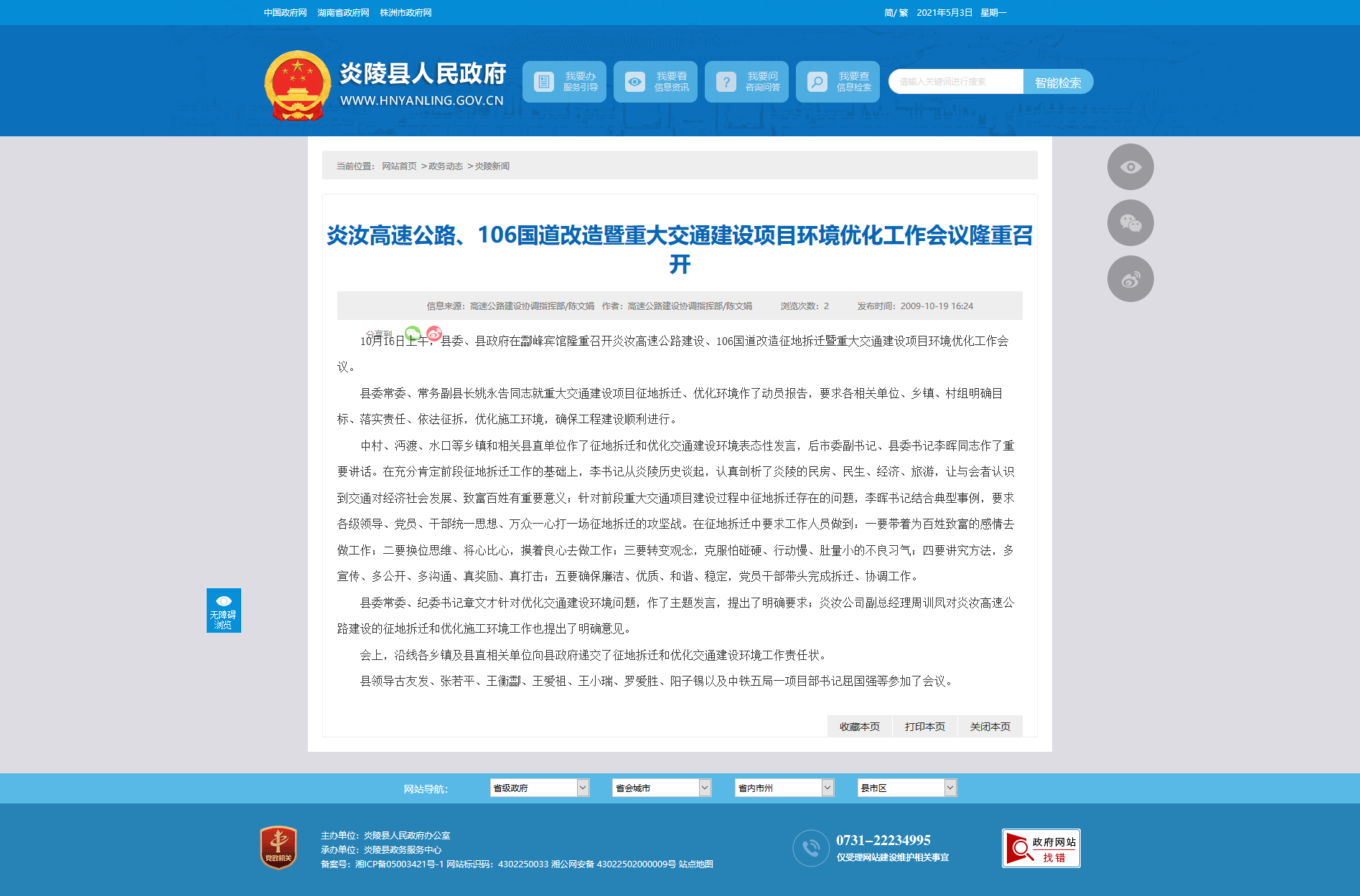 中村、沔渡、水口等乡镇和相关县直单位作了征地拆迁和优化交通建设环境表态性发言,后市委副书记、县委书记李晖同志作了重要讲话。在充分肯定前段征地拆迁工作的基础上,李书记从炎陵历史谈起,认真剖析了炎陵的民房、民生、经济、旅游,让与会者认识到交通对经济社会发展、致富百姓有重要意义;针对前段重大交通项目建设过程中征地拆迁存在的问题,李晖书记结合典型事例,要求各级领导、党员、干部统一思想、万众一心打一场征地拆迁的攻坚战。在征地拆迁中要求工作人员做到:一要带着为百姓致富的感情去做工作;二要换位思维、将心比心,摸着良心去做工作;三要转变观念,克服怕碰硬、行动慢、肚量小的不良习气;四要讲究方法,多宣传、多公开、多沟通、真奖励、真打击;五要确保廉洁、优质、和谐、稳定,党员干部带头完成拆迁、协调工作。