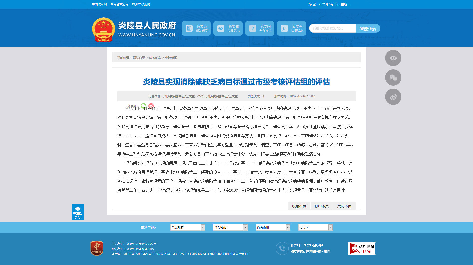 2009年10月13-14日,由株洲市盐务局石振球局长带队、市卫生局、市疾控中心人员组成的碘缺乏项目评估小组一行5人来到我县,对我县实现消除碘缺乏病目标各项工作指标进行考核评估。考评组按照《株洲市实现消除碘缺乏病目标县级考核评估实施方案》要求,对我县碘缺乏病防治组织领导、碘盐管理、监测与防治、健康教育等管理指标和居民合格碘盐食用率、8-10岁儿童尿碘水平等技术指标进行综合考评,通过查阅资料、学校问卷调查、碘盐销售网点现场调查等方法,查阅了县疾控中心近三年来的碘盐监测和疾病监测资料、查看了县盐务管理局、县技监局、工商局等部门近几年对盐业市场管理情况,调查了三河、河西、沔渡、石洲、霞阳5个乡镇小学5年级学生碘缺乏病防治知识知晓情况,最后对各项工作指标进行综合评分,认为炎陵县已达到实现消除碘缺乏病目标。
