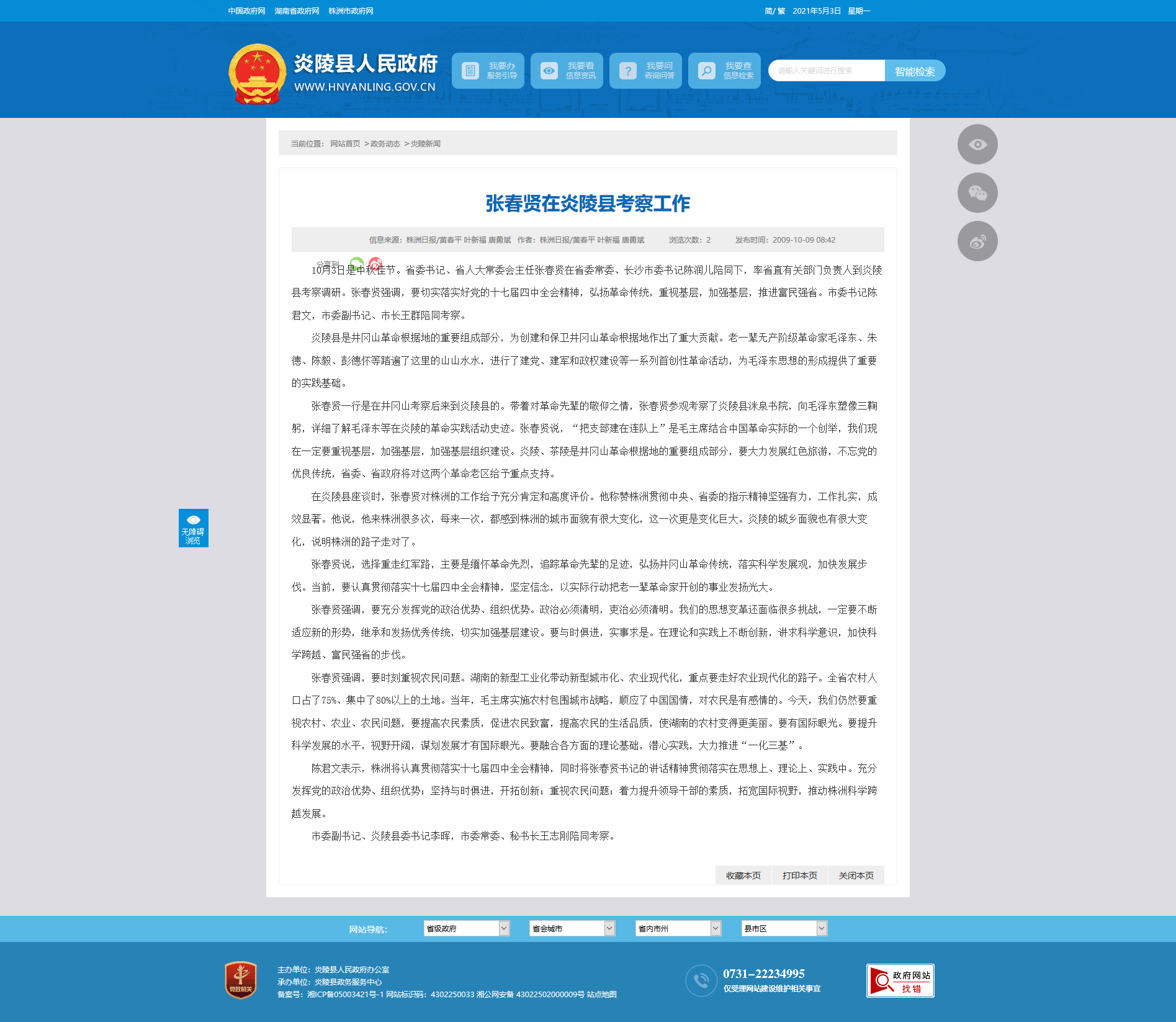 在炎陵县座谈时,张春贤对株洲的工作给予充分肯定和高度评价。他称赞株洲贯彻中央、省委的指示精神坚强有力,工作扎实,成效显著。他说,他来株洲很多次,每来一次,都感到株洲的城市面貌有很大变化,这一次更是变化巨大。炎陵的城乡面貌也有很大变化,说明株洲的路子走对了。