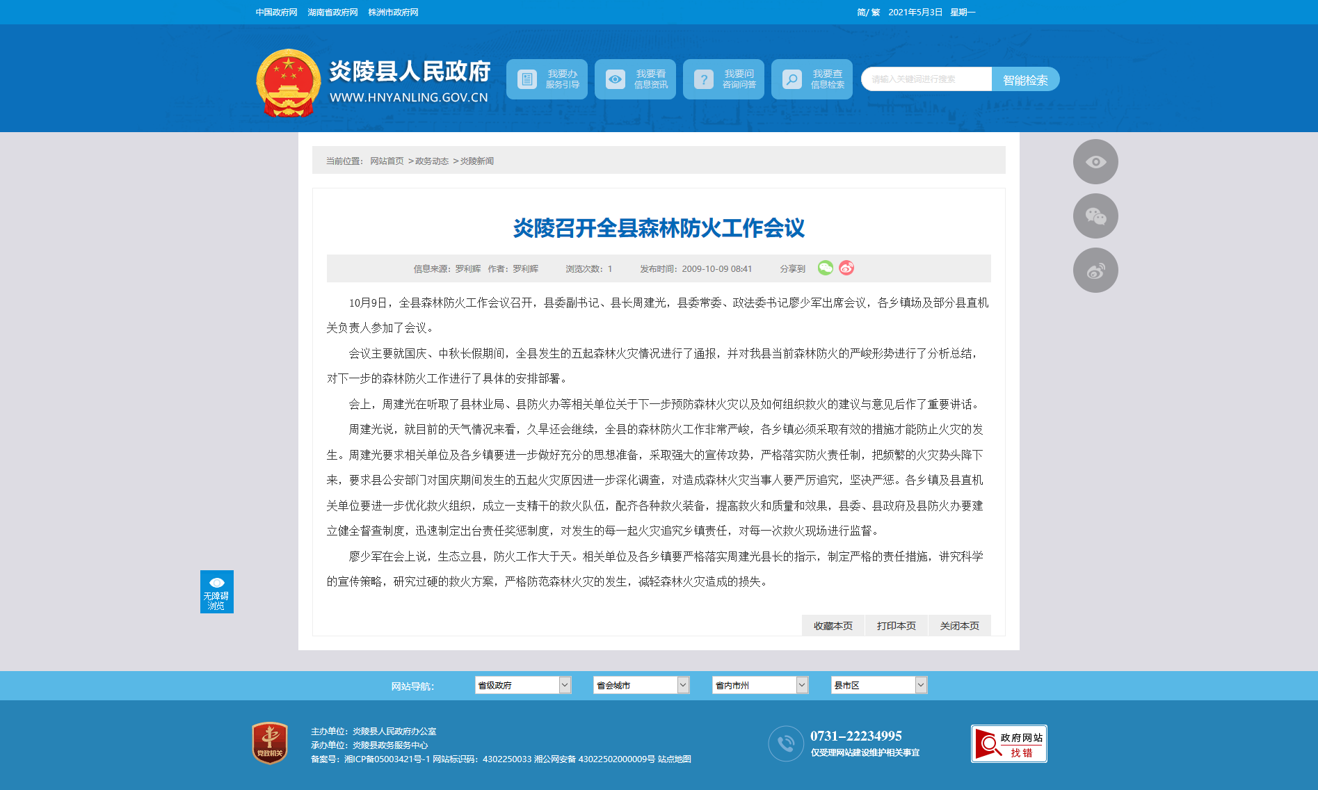 廖少军在会上说,生态立县,防火工作大于天。相关单位及各乡镇要严格落实周建光县长的指示,制定严格的责任措施,讲究科学的宣传策略,研究过硬的救火方案,严格防范森林火灾的发生,减轻森林火灾造成的损失。