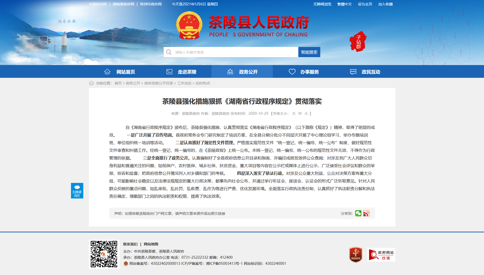 自《湖南省行政程序规定》颁布后,茶陵县强化措施,认真贯彻落实《湖南省行政程序规定》(以下简称《规定》)精神,取得了明显的成效。 一是广泛开展了宣传培训。县政府常务会专门研究制定了培训方案,在全县分期分批分不同层次开展了中心理论组学习、举办专题培训班、单位组织统一培训等活动。 二是认真抓好了规范性文件管理。严格落实规范性文件“统一登记、统一编号、统一公布”制度,做好规范性文件审查和纠错工作。经统一登记、统一编号的,在《茶陵政报》上统一公布。未统一登记、统一编号、统一公布的规范性文件无效,不得作为行政管理的依据。 三是全面推行了政务公开。认真编制好了全县政府信息公开目录和指南,并编印成册发放供公众查阅;对涉及到广大人民群众切身利益和普遍关注的问题,如低保户、农村医保、城乡社保、扶贫资金、重大项目等内容在公示栏或媒体上进行公示,广泛接受社会评议和群众的举报、投诉和监督;把政府信息公开情况列入对乡镇和部门的考核。 四是深入落实了依法行政。对涉及公众重大利益、公众对决策方案有重大分歧,可能影响社会稳定以及法律法规规定的重大行政决策,都事先向社会公布,并通过举行听证会、座谈会、认证会的形式广泛听取意见。针对人民群众反映的重点问题,如乱审批、乱处罚、乱收费、乱作为等进行严查,优化发展环境。全面落实行政执法责任制,认真抓好了执法职责分解和执法责任确定,理顺部门之间的执法职责和权限,提高了执法效率。