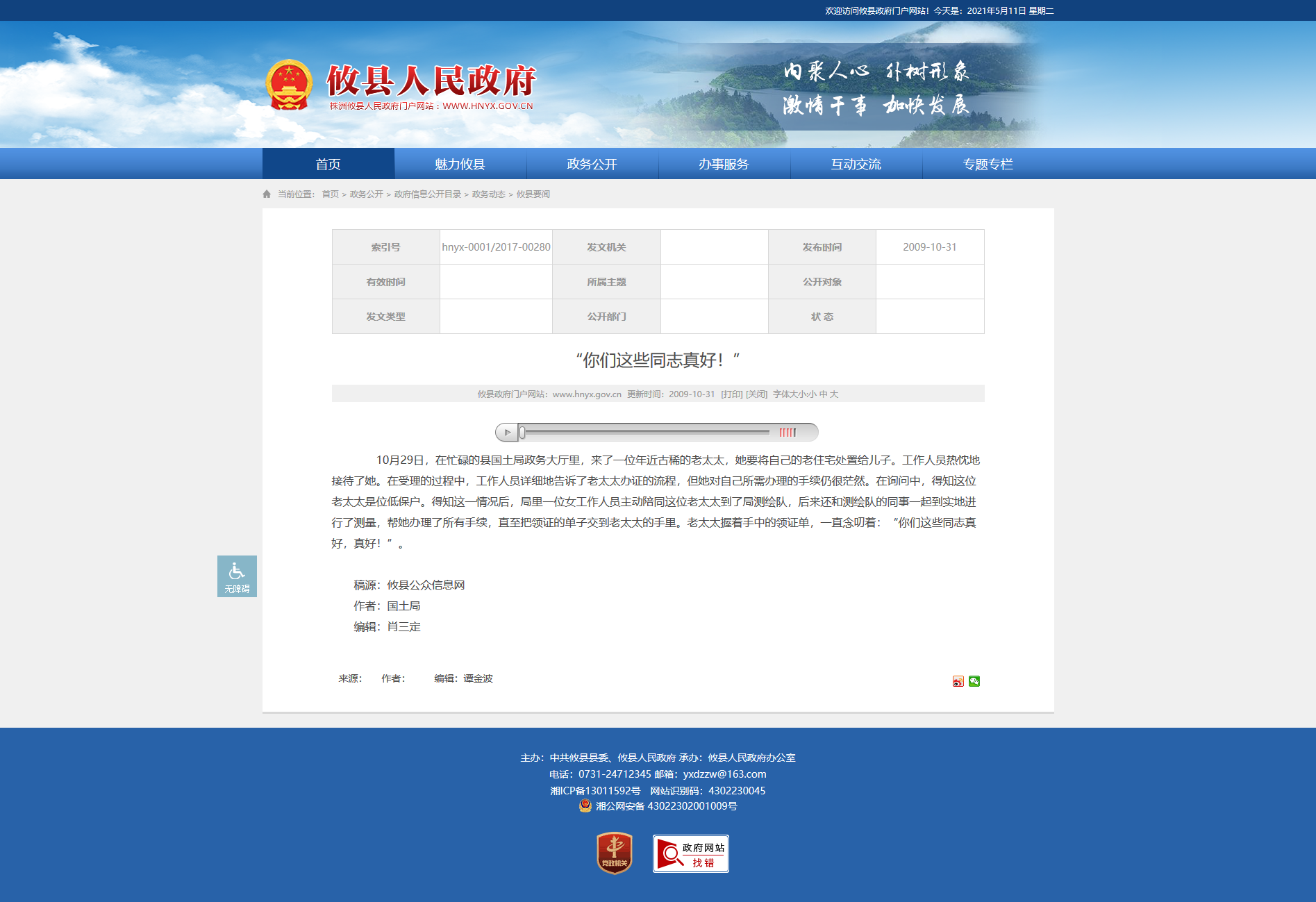 10月29日,在忙碌的县国土局政务大厅里,来了一位年近古稀的老太太,她要将自己的老住宅处置给儿子。工作人员热忱地接待了她。在受理的过程中,工作人员详细地告诉了老太太办证的流程,但她对自己所需办理的手续仍很茫然。在询问中,得知这位老太太是位低保户。得知这一情况后,局里一位女工作人员主动陪同这位老太太到了局测绘队,后来还和测绘队的同事一起到实地进行了测量,帮她办理了所有手续,直至把领证的单子交到老太太的手里。老太太握着手中的领证单,一直念叨着:“你们这些同志真好,真好!”。