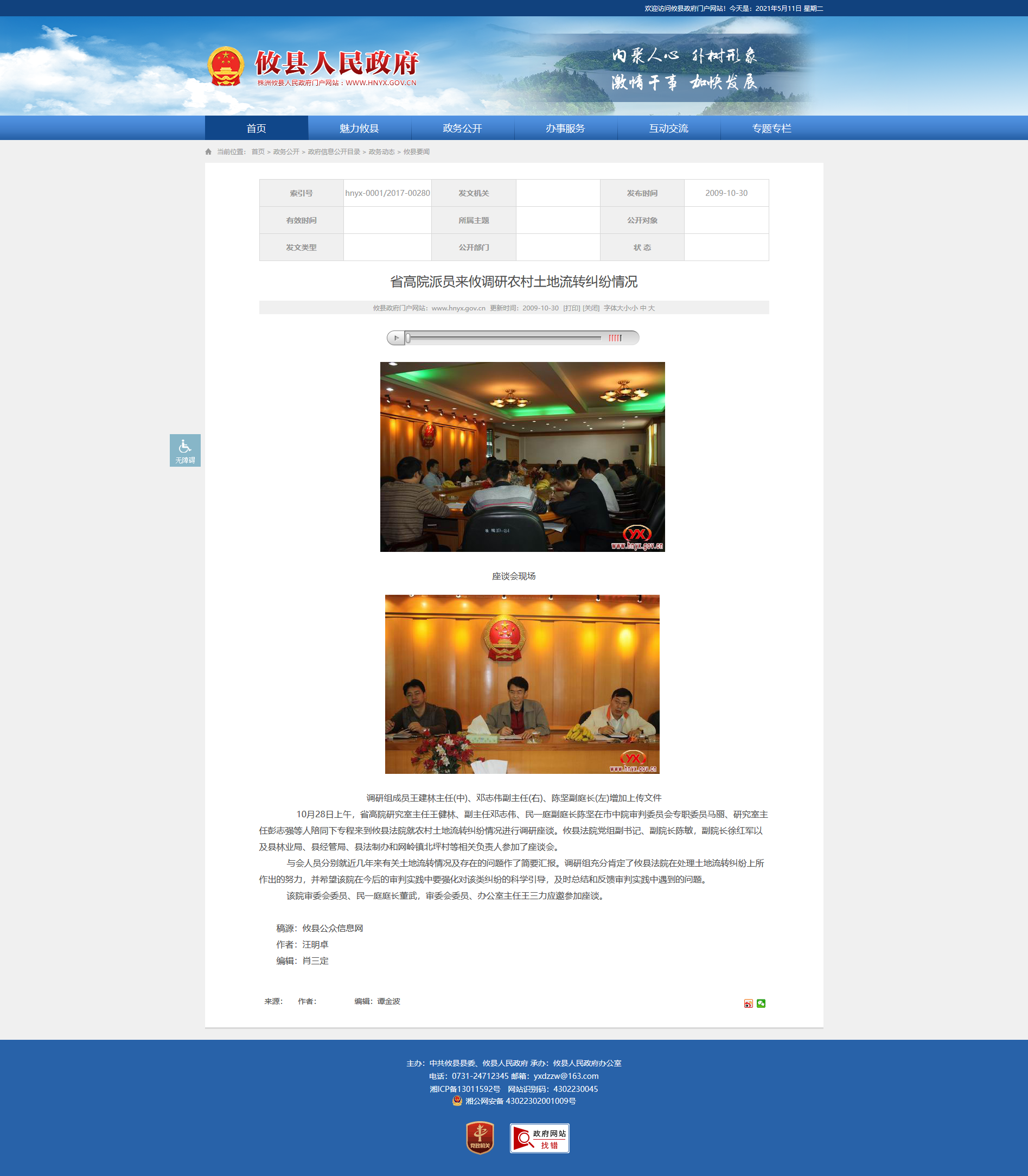 10月28日上午,省高院研究室主任王健林、副主任邓志伟、民一庭副庭长陈坚在市中院审判委员会专职委员马丽、研究室主任彭志强等人陪同下专程来到攸县法院就农村土地流转纠纷情况进行调研座谈。攸县法院党组副书记、副院长陈敏,副院长徐红军以及县林业局、县经管局、县法制办和网岭镇北坪村等相关负责人参加了座谈会。