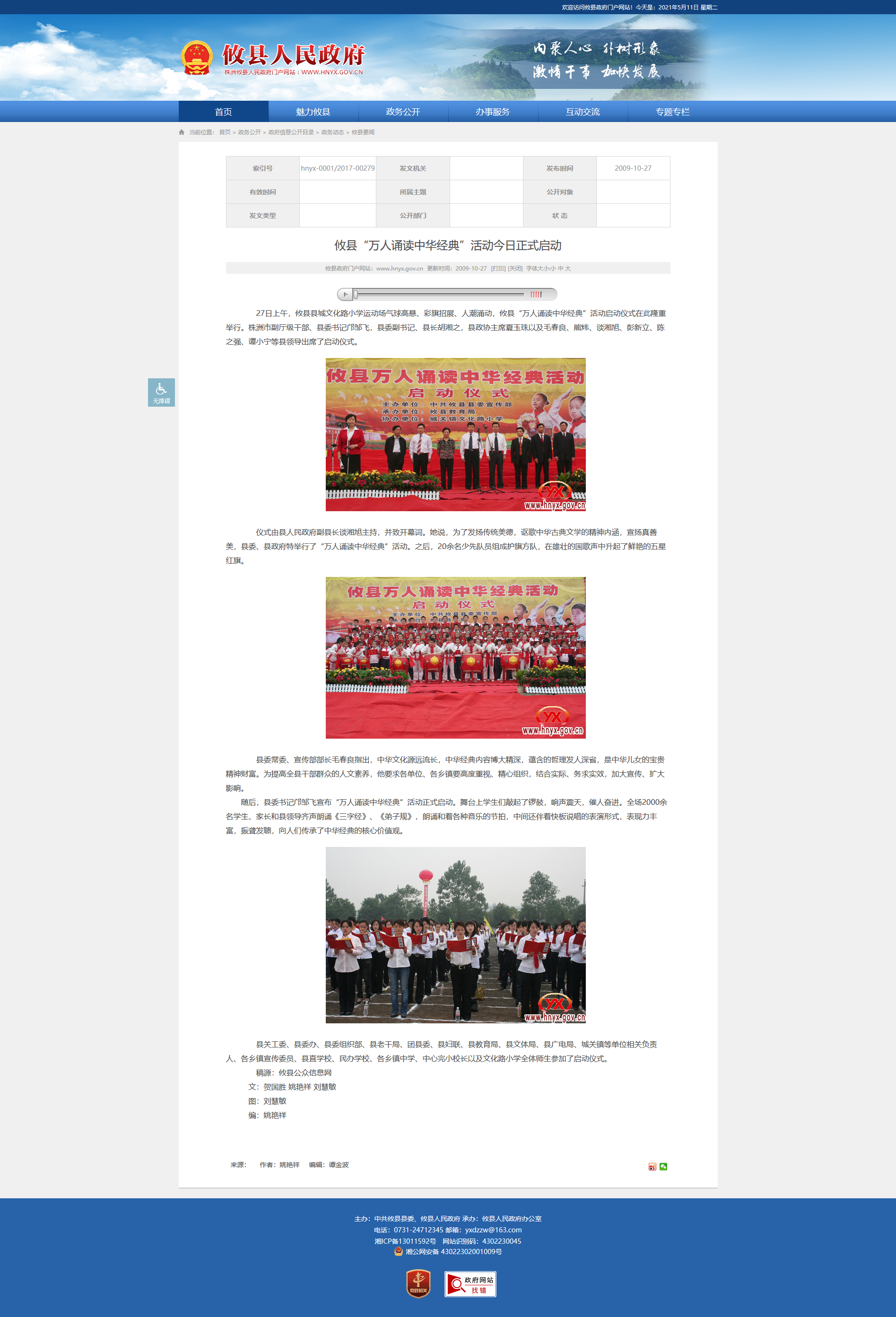 仪式由县人民政府副县长谈湘旭主持,并致开幕词。她说,为了发扬传统美德,讴歌中华古典文学的精神内涵,宣扬真善美,县委、县政府特举行了“万人诵读中华经典”活动。之后,20余名少先队员组成护旗方队,在雄壮的国歌声中升起了鲜艳的五星红旗。