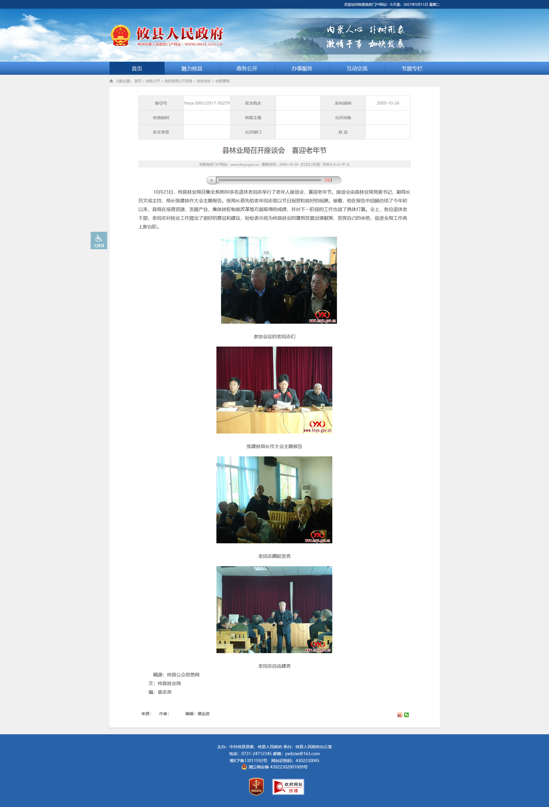 10月23日,攸县林业局召集全系统80多名退休老同志举行了老年人座谈会,喜迎老年节。座谈会由县林业局党委书记、副局长吕文成主持,局长张建林作大会主题报告。张局长首先给老年同志致以节日祝贺和良好的祝愿。接着,他在报告中回顾总结了今年初以来,县局在培育资源、发展产业、集体林权制度改革等方面取得的成绩,并对下一阶段的工作也谈了具体打算。会上,各位退休老干部、老同志对林业工作提出了很好的意见和建议,纷纷表示将为攸县林业的蓬勃发展出谋献策,发挥自己的余热,促进全局工作再上新台阶。