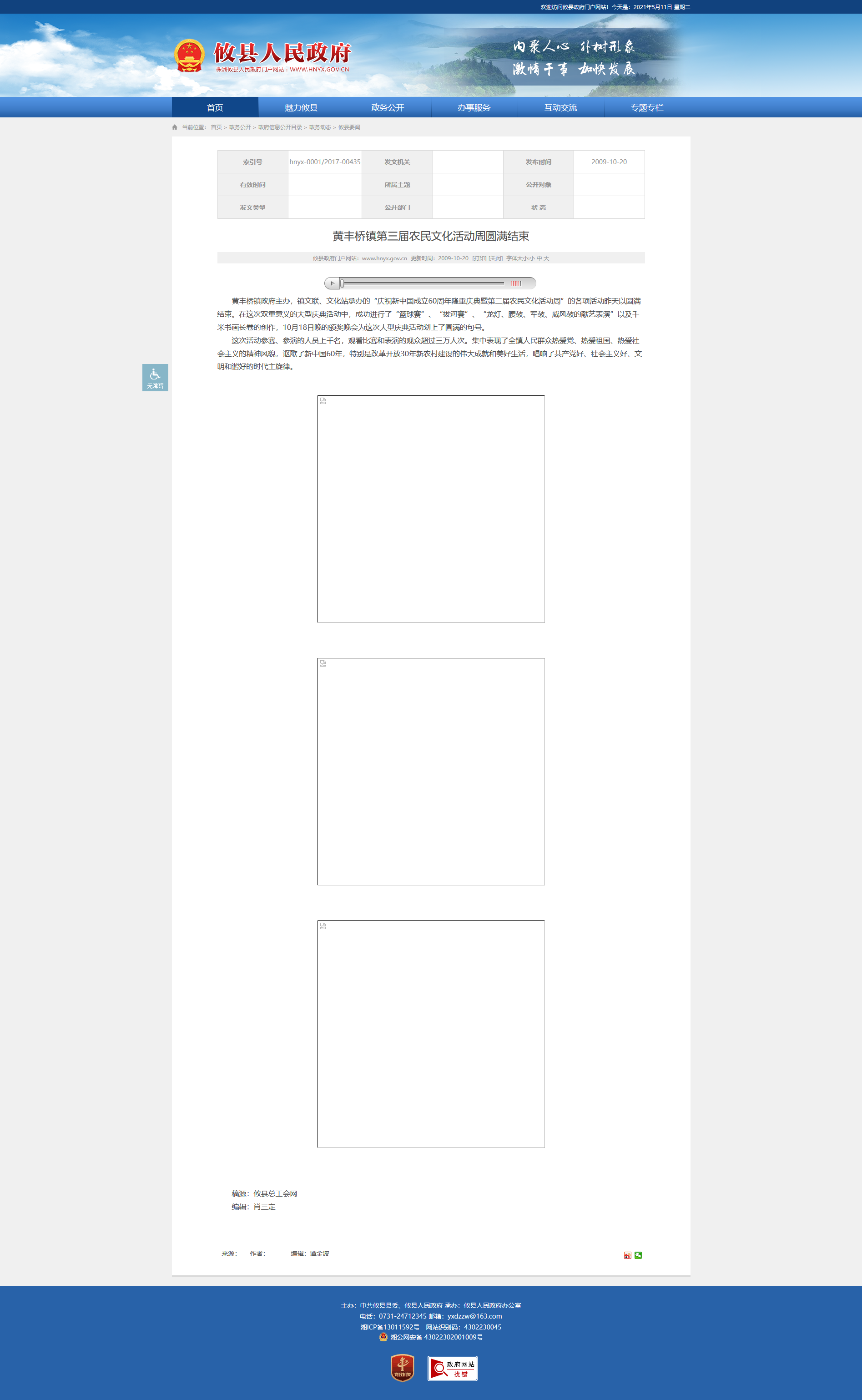 黄丰桥镇政府主办,镇文联、文化站承办的“庆祝新中国成立60周年隆重庆典暨第三届农民文化活动周”的各项活动昨天以圆满结束。在这次双重意义的大型庆典活动中,成功进行了“篮球赛”、“拔河赛”、“龙灯、腰鼓、军鼓、威风鼓的献艺表演”以及千米书画长卷的创作,10月18日晚的颁奖晚会为这次大型庆典活动划上了圆满的句号。