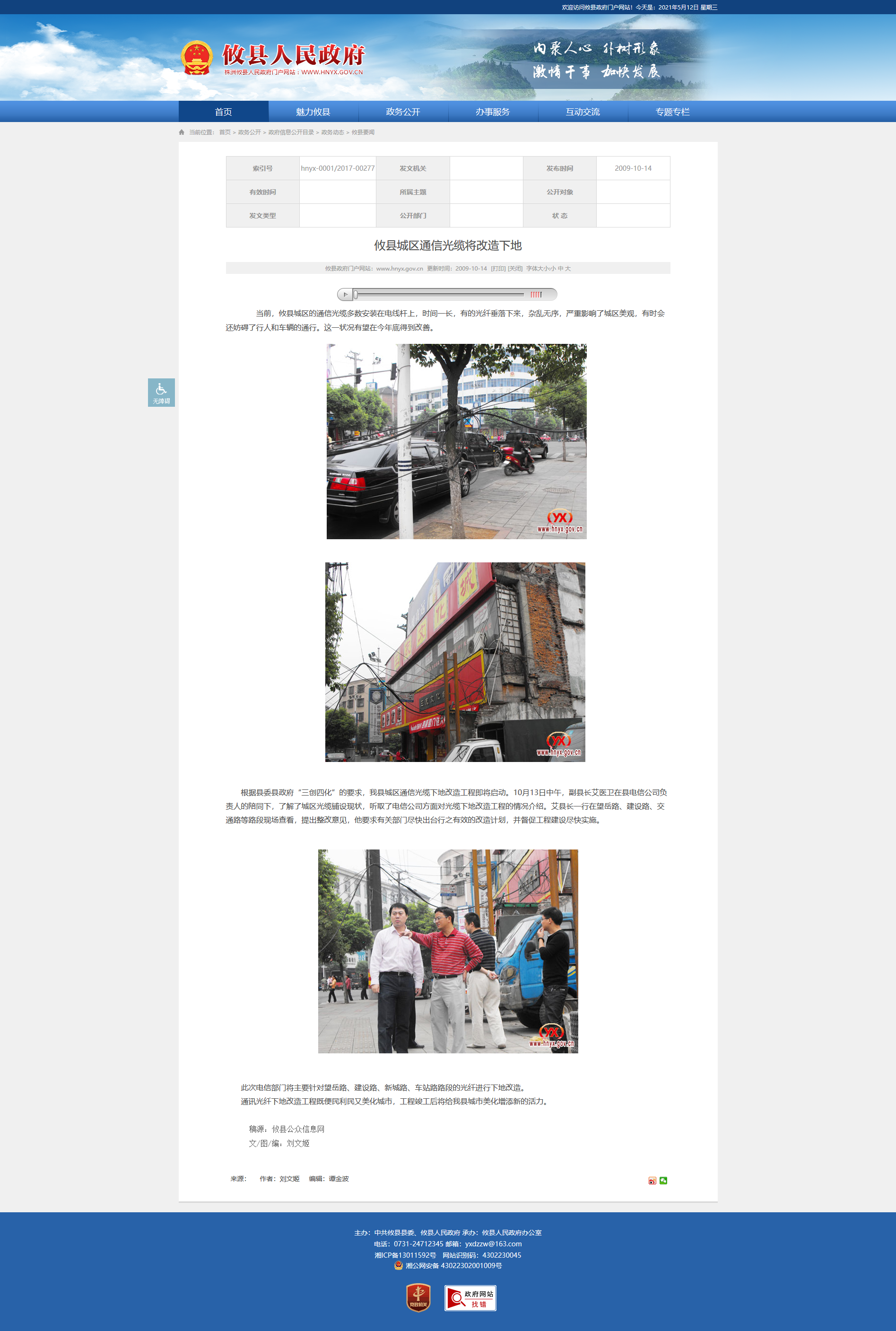 根据县委县政府“三创四化”的要求,我县城区通信光缆下地改造工程即将启动。10月13日中午,副县长艾医卫在县电信公司负责人的陪同下,了解了城区光缆铺设现状,听取了电信公司方面对光缆下地改造工程的情况介绍。艾县长一行在望岳路、建设路、交通路等路段现场查看,提出整改意见,他要求有关部门尽快出台行之有效的改造计划,并督促工程建设尽快实施。