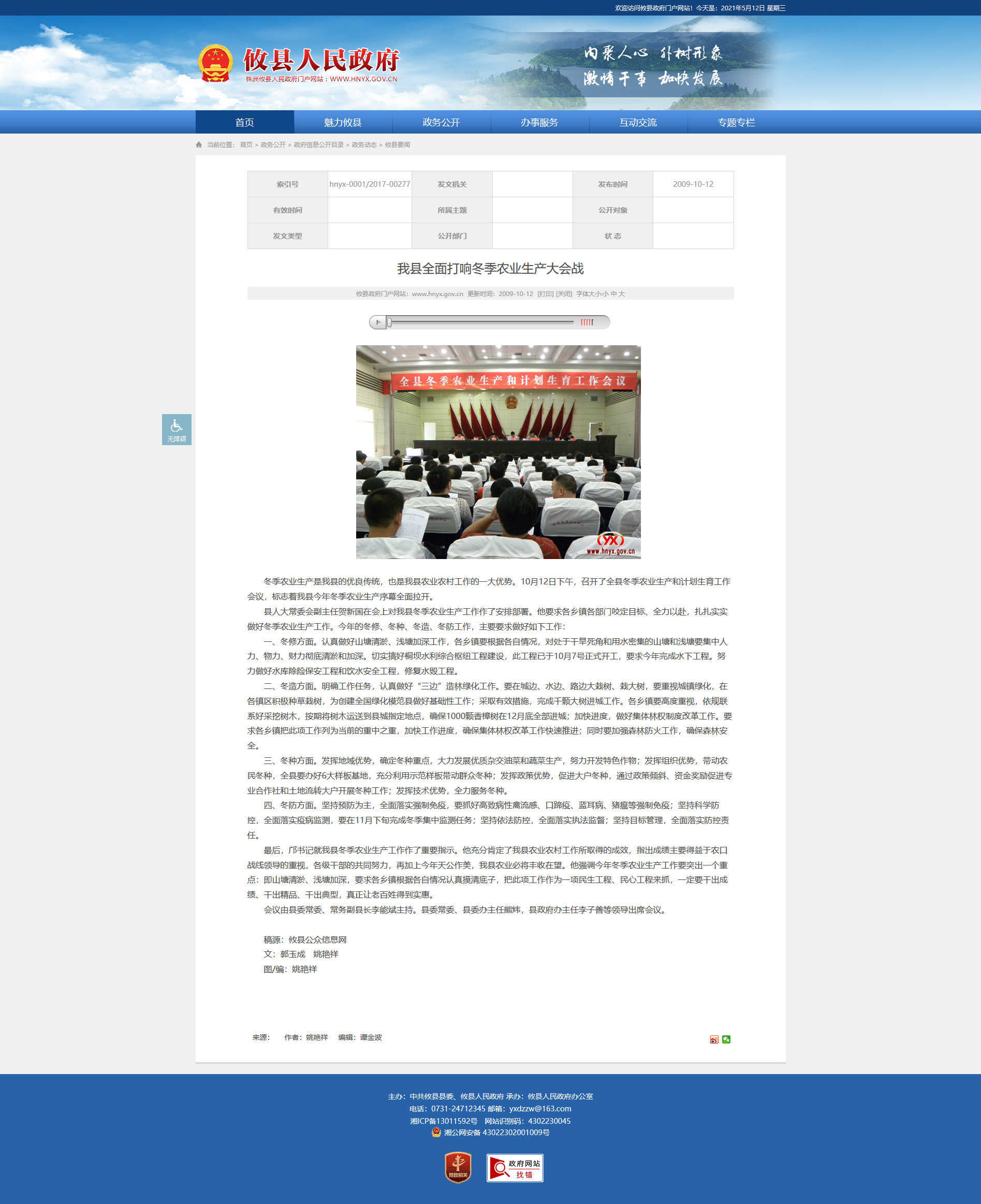 最后,邝书记就我县冬季农业生产工作作了重要指示。他充分肯定了我县农业农村工作所取得的成效,指出成绩主要得益于农口战线领导的重视,各级干部的共同努力,再加上今年天公作美,我县农业必将丰收在望。他强调今年冬季农业生产工作要突出一个重点:即山塘清淤、浅塘加深,要求各乡镇根据各自情况认真摸清底子,把此项工作作为一项民生工程、民心工程来抓,一定要干出成绩、干出精品、干出典型,真正让老百姓得到实惠。