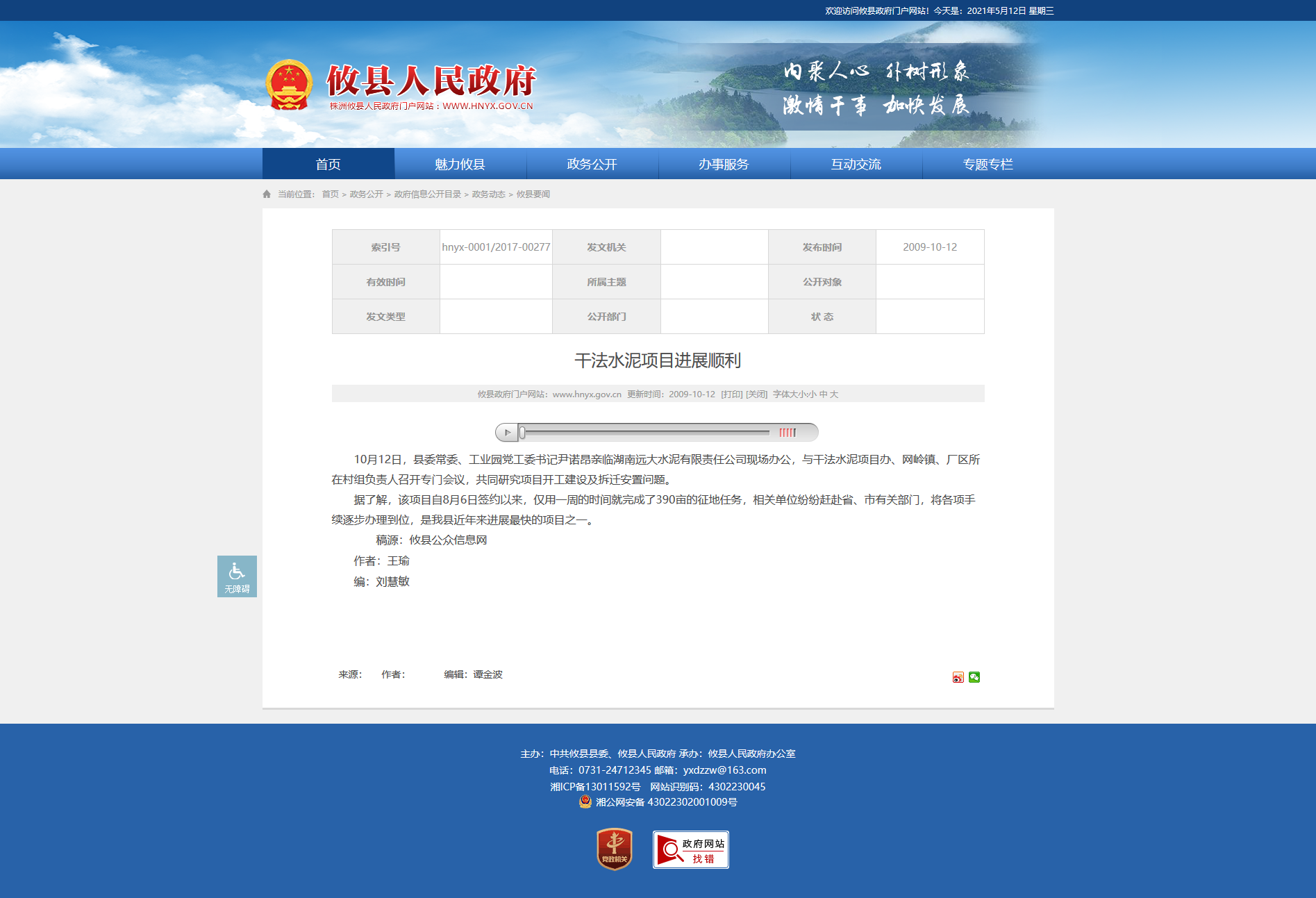 10月12日,县委常委、工业园党工委书记尹诺昂亲临湖南远大水泥有限责任公司现场办公,与干法水泥项目办、网岭镇、厂区所在村组负责人召开专门会议,共同研究项目开工建设及拆迁安置问题。