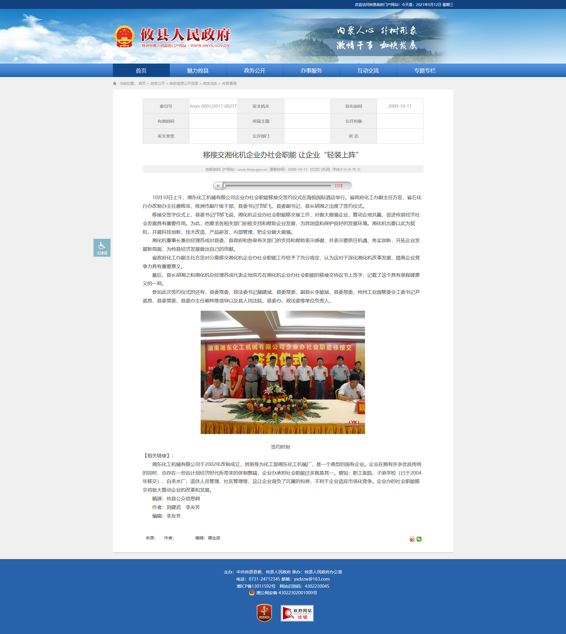 签约时刻 【相关链接】: 湘东化工机械有限公司于2002年改制成立,其前身为化工部湘东化工机械厂,是一个典型的国有企业。企业在拥有许多优良传统的同时,也存在一些由计划经济时代所带来的体制弊端,企业办承担社会职能过多就是其一。譬如:职工医院、子弟学校(已于2004年移交)、自来水厂、退休人员管理、社区管理等,这让企业背负了沉重的包袱,不利于企业适应市场化竞争。企业办的社会职能移交将极大推动企业的改革和发展。 稿源:攸县公众信息网