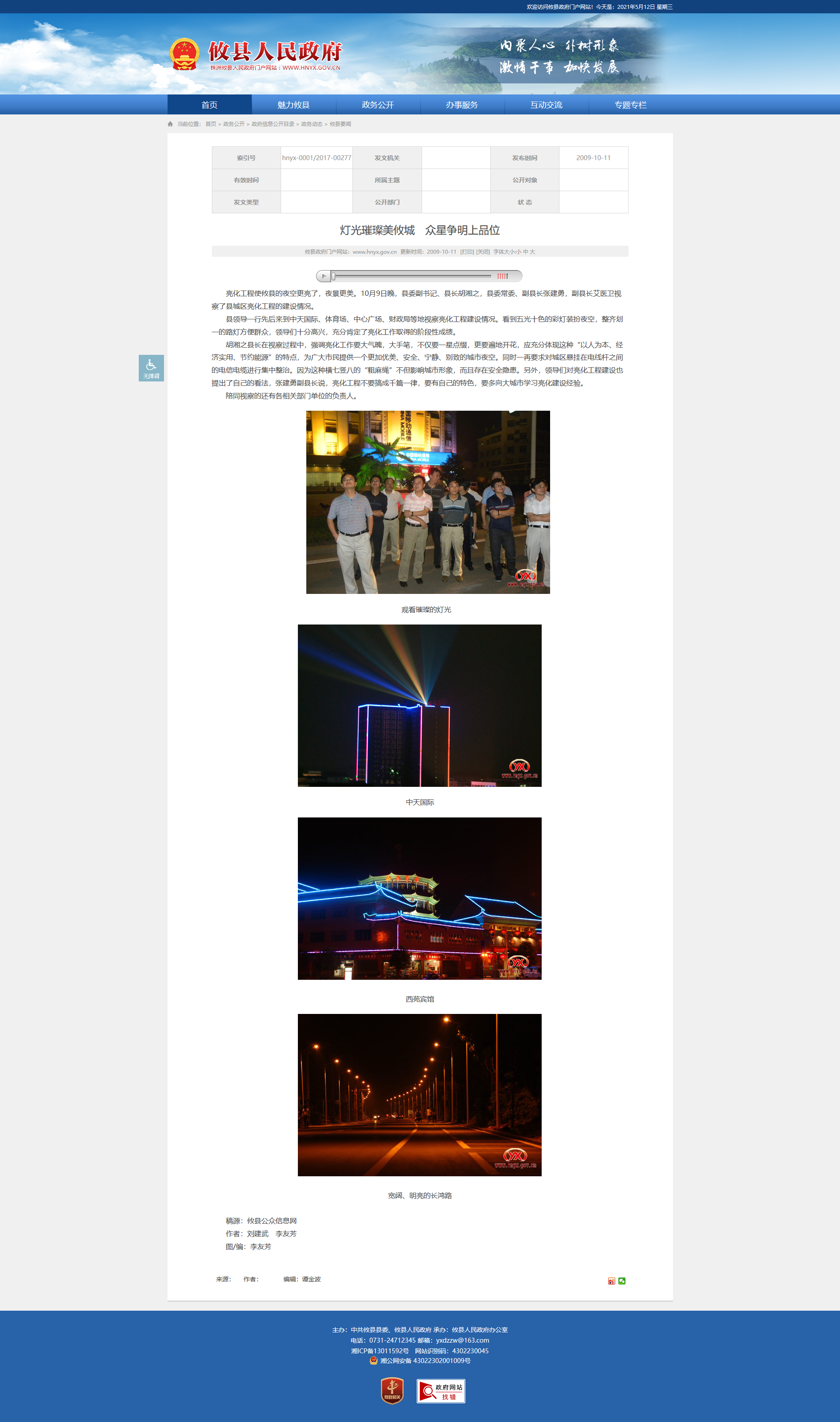 胡湘之县长在视察过程中,强调亮化工作要大气魄,大手笔,不仅要一星点缀,更要遍地开花,应充分体现这种“以人为本、经济实用、节约能源”的特点,为广大市民提供一个更加优美、安全、宁静、别致的城市夜空。同时一再要求对城区悬挂在电线杆之间的电信电缆进行集中整治。因为这种横七竖八的“粗麻绳”不但影响城市形象,而且存在安全隐患。另外,领导们对亮化工程建设也提出了自己的看法,张建勇副县长说,亮化工程不要搞成千篇一律,要有自己的特色,要多向大城市学习亮化建设经验。