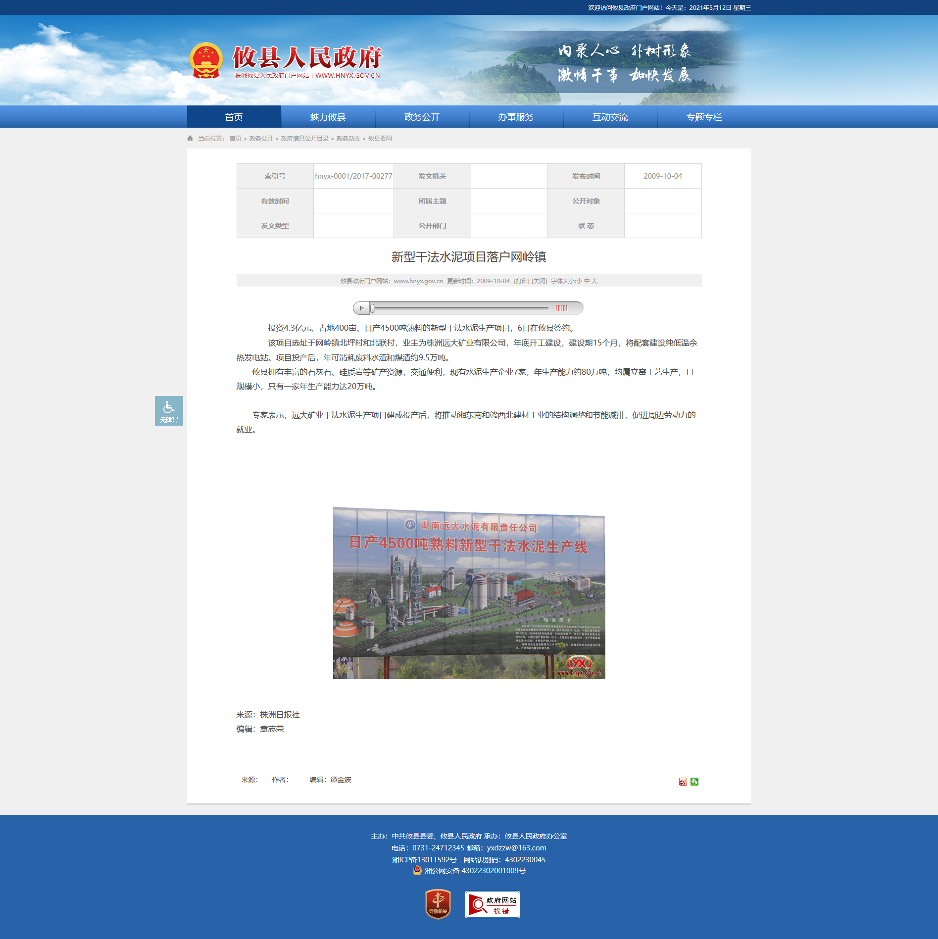 投资4.3亿元、占地400亩、日产4500吨熟料的新型干法水泥生产项目,6日在攸县签约。