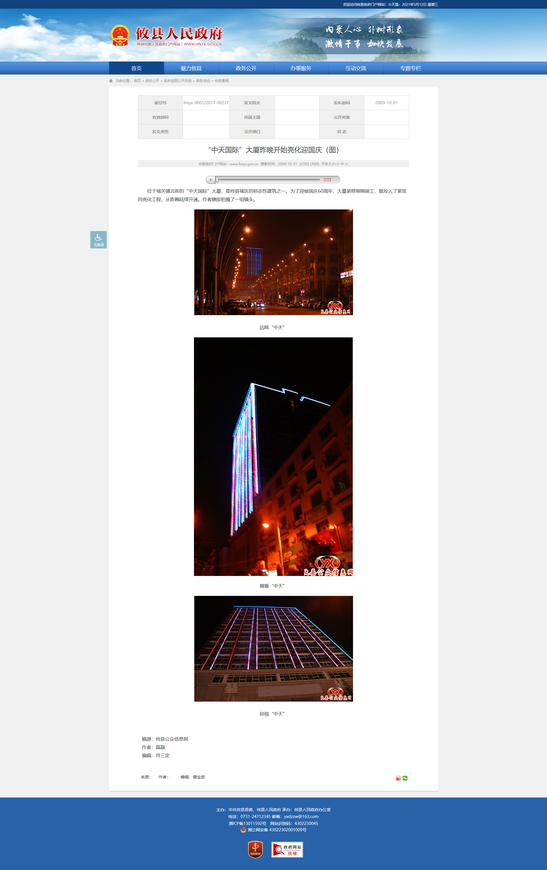 位于城关镇北街的“中天国际”大厦,是攸县城区的标志性建筑之一。为了迎接国庆60周年,大厦装修刚刚竣工,就投入了紧张的亮化工程,从昨晚陆续开通。作者随即拍摄了一组镜头。