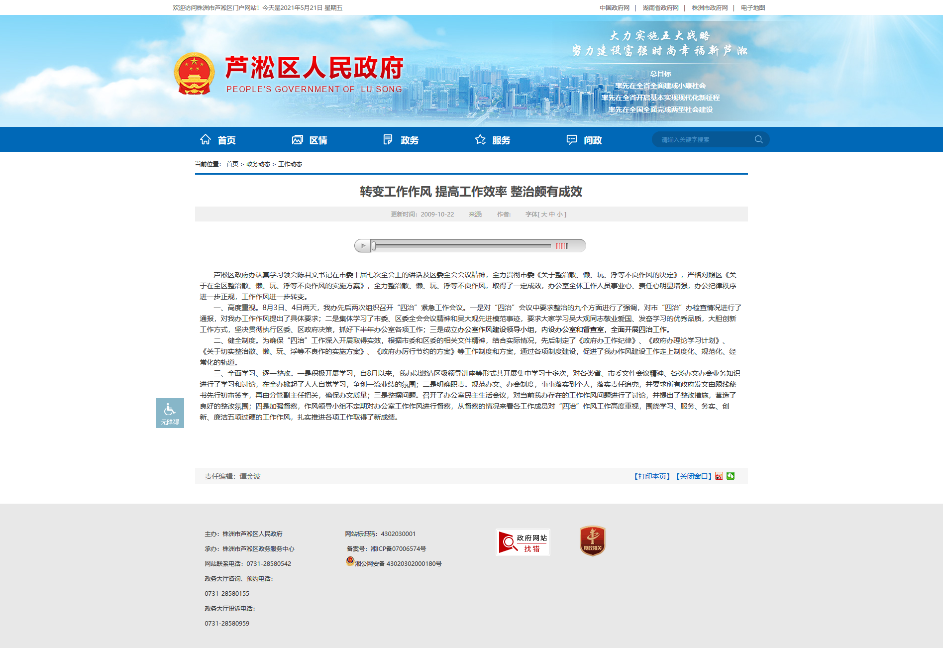 芦淞区政府办认真学习领会陈君文书记在市委十届七次全会上的讲话及区委全会会议精神,全力贯彻市委《关于整治散、懒、玩、浮等不良作风的决定》,严格对照区《关于在全区整治散、懒、玩、浮等不良作风的实施方案》,全力整治散、懒、玩、浮等不良作风,取得了一定成效,办公室全体工作人员事业心、责任心明显增强,办公纪律秩序进一步正规,工作作风进一步转变。一、高度重视。8月3日、4日两天,我办先后两次组织召开“四治”紧急工作会议。一是对“四治”会议中要求整治的九个方面进行了强调,对市“四治”办检查情况进行了通报,对我办工作作风提出了具体要求;二是集体学习了市委、区委全会会议精神和吴大观先进模范事迹,要求大家学习吴大观同志敬业爱国、发奋学习的优秀品质,大胆创新工作方式,坚决贯彻执行区委、区政府决策,抓好下半年办公室各项工作;三是成立办公室作风建设领导小组,内设办公室和督查室,全面开展四治工作。二、健全制度。为确保“四治”工作深入开展取得实效,根据市委和区委的相关文件精神,结合实际情况,先后制定了《政府办工作纪律》、《政府办理论学习计划》、《关于切实整治散、懒、玩、浮等不良作的实施方案》、《政府办厉行节约的方案》等工作制度和方案,通过各项制度建设,促进了我办作风建设工作走上制度化、规范化、经常化的轨道。三、全面学习、逐一整改。一是积极开展学习,自8月以来,我办以邀请区级领导讲座等形式共开展集中学习十多次,对各类省、市委文件会议精神、各类办文办会业务知识进行了学习和讨论,在全办掀起了人人自觉学习,争创一流业绩的氛围;二是明确职责。规范办文、办会制度,事事落实到个人,落实责任追究,并要求所有政府发文由跟线秘书先行初审签字,再由分管副主任把关,确保办文质量;三是整摆问题。召开了办公室民主生活会议,对当前我办存在的工作作风问题进行了讨论,并提出了整改措施,营造了良好的整改氛围;四是加强督察,作风领导小组不定期对办公室工作作风进行督察,从督察的情况来看各工作成员对“四治”作风工作高度重视,围绕学习、服务、务实、创新、廉洁五项过硬的工作作风,扎实推进各项工作取得了新成绩。