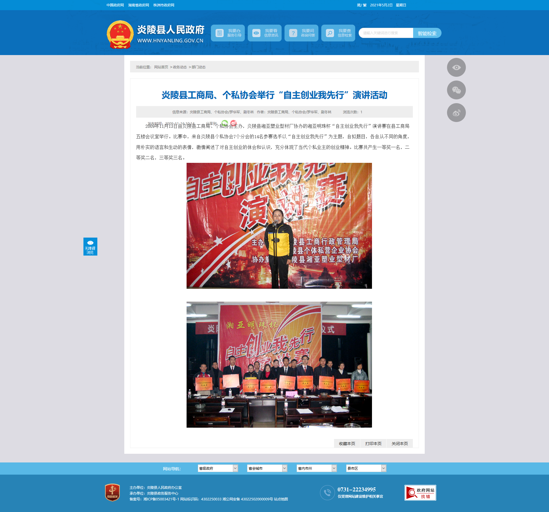 2009年11月13日由炎陵县工商局、个私协会主办,炎陵县湘亚塑业型材厂协办的湘亚明珠杯“自主创业我先行”演讲赛在县工商局五楼会议室举行。比赛中,来自炎陵县个私协会7个分会的14名参赛选手以“自主创业我先行”为主题,自拟题目,各自从不同的角度,用朴实的语言和生动的表情,激情阐述了对自主创业的体会和认识,充分体现了当代个私业主的创业精神。比赛共产生一等奖一名,二等奖二名,三等奖三名。