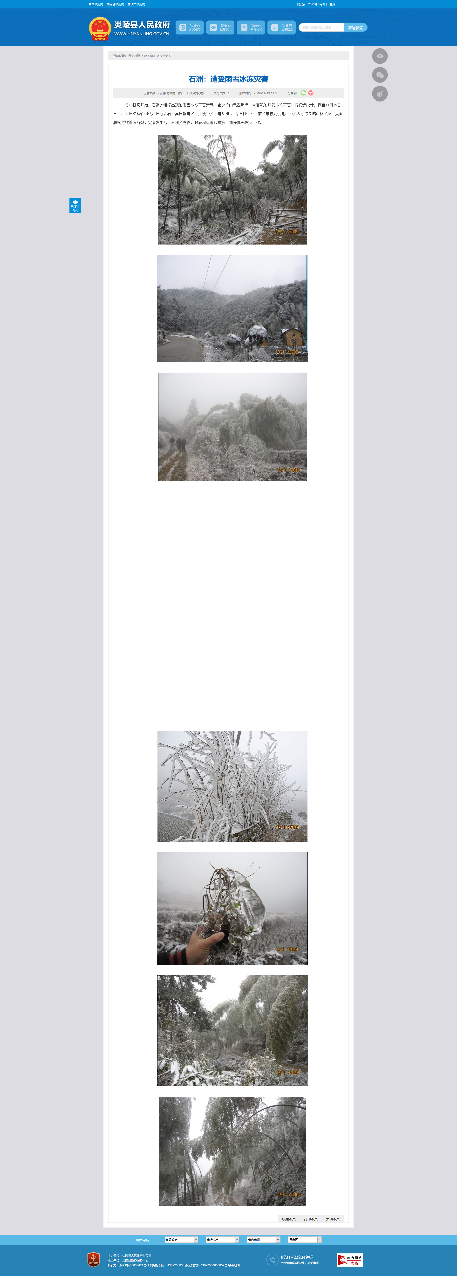 11月16日晚开始,石洲乡连续出现的雨雪冰冻灾害天气,全乡境内气温骤降,大面积的遭受冰冻灾害。据初步统计,截至11月19日早上,因冰冻楠竹倒伏,压断青石村高压输电线,致使全乡停电5小时,青石村全村目前还未恢复供电;全乡因冰冻造成山林受灾,大面积楠竹被雪压断裂。灾情发生后,石洲乡党委、政府积极采取措施,加强抗灾救灾工作。