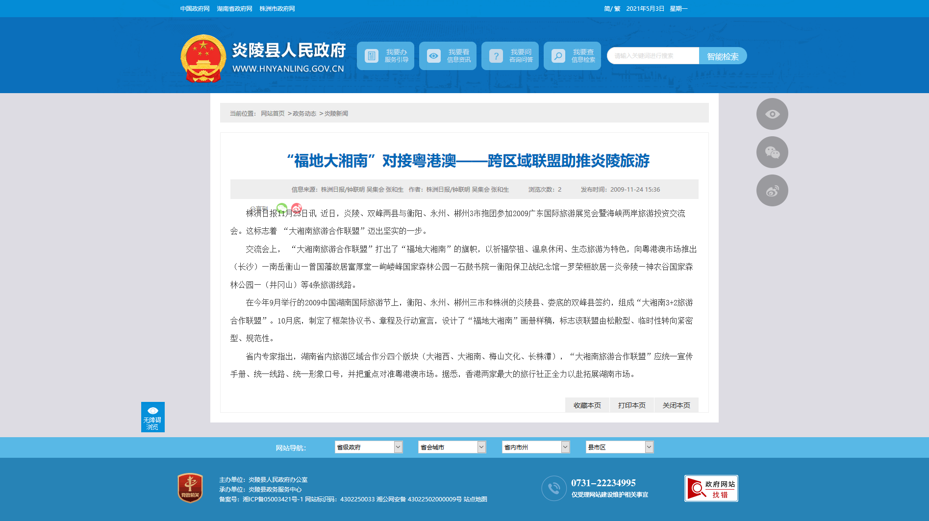 在今年9月举行的2009中国湖南国际旅游节上,衡阳、永州、郴州三市和株洲的炎陵县、娄底的双峰县签约,组成“大湘南3 2旅游合作联盟”。10月底,制定了框架协议书、章程及行动宣言,设计了“福地大湘南”画册样稿,标志该联盟由松散型、临时性转向紧密型、规范性。