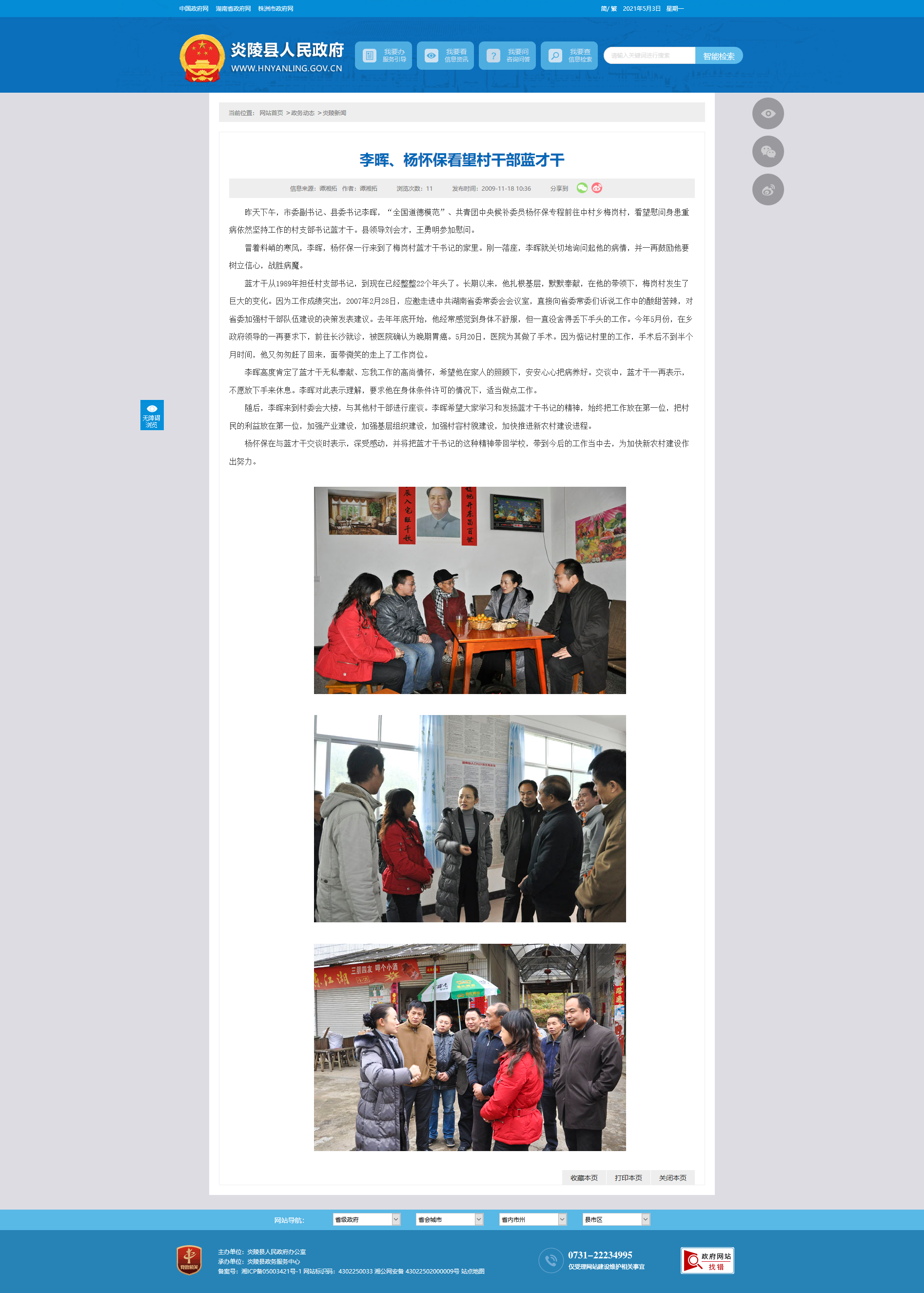 冒着料峭的寒风,李晖,杨怀保一行来到了梅岗村蓝才干书记的家里。刚一落座,李晖就关切地询问起他的病情,并一再鼓励他要树立信心,战胜病魔。