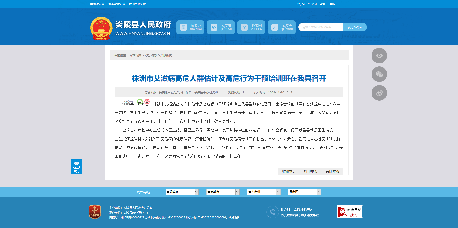2009年11月12日,株洲市艾滋病高危人群估计及高危行为干预培训班在我县酃峰宾馆召开。出席会议的领导有省疾控中心性艾科科长陈曦、市卫生局疾控科科长刘建军、市疾控中心主任龙术国、县卫生局局长黄建中、县卫生局分管副局长黄子奎。与会人员有五县四区疾控中心分管副主任、性艾科科长、市疾控中心性艾科全体人员共35人。