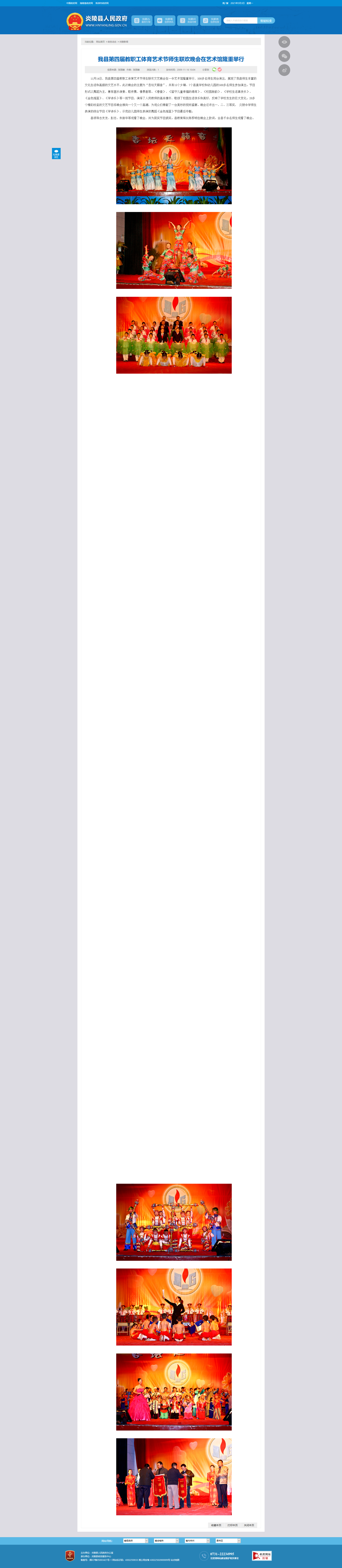 11月14日,我县第四届教职工体育艺术节师生联欢文艺晚会在一中艺术馆隆重举行,500多名师生同台演出,展现了我县师生丰富的文化生活和高超的文艺水平。此次晚会的主题为“杏坛天籁音”,共有15个乡镇、7个县直学校和幼儿园的500多名师生参加演出。节目形式以舞蹈为主,兼有器乐演奏、歌伴舞、情景剧等。《春蚕》、《留守儿童幸福的港湾》、《校园新韵》、《学校生活真快乐》、《金色摇篮》、《学诗乐》等一批节目,演绎了人民教师的高尚情怀,歌颂了校园生活快乐和美好,反映了学校发生的巨大变化。20多个精彩纷呈的文艺节目将晚会推向一个又一个高潮,为观众们奉献了一台美妙的视听盛宴。晚会还评出一、二、三等奖, 炎陵中学师生表演的综合节目《学诗乐》、示范幼儿园师生表演的舞蹈《金色摇篮》节目最后夺魁。