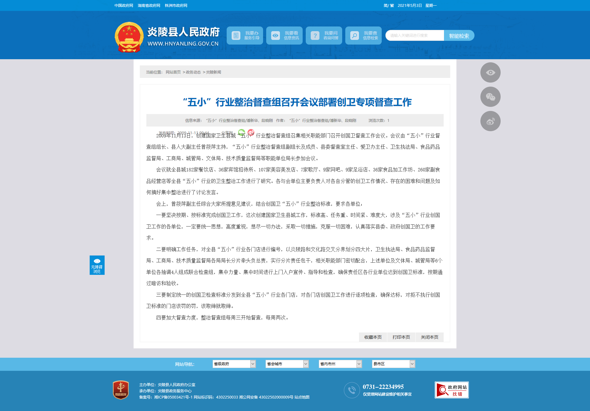 二要明确工作任务,对全县“五小”行业各门店进行编号,以炎陵路和文化路交叉分界划分四大片,卫生执法局、食品药品监督局、工商局、技术质量监督局各局局长分片牵头负总责,实行分片责任包干,相关职能部门密切配合,上述单位及文体局、城管局等6个单位各抽调4人组成联合检查组,集中力量、集中时间进行上门入户宣传、指导和检查,确保责任区各行业单位达到创国卫标准,按期通过暗访和验收。