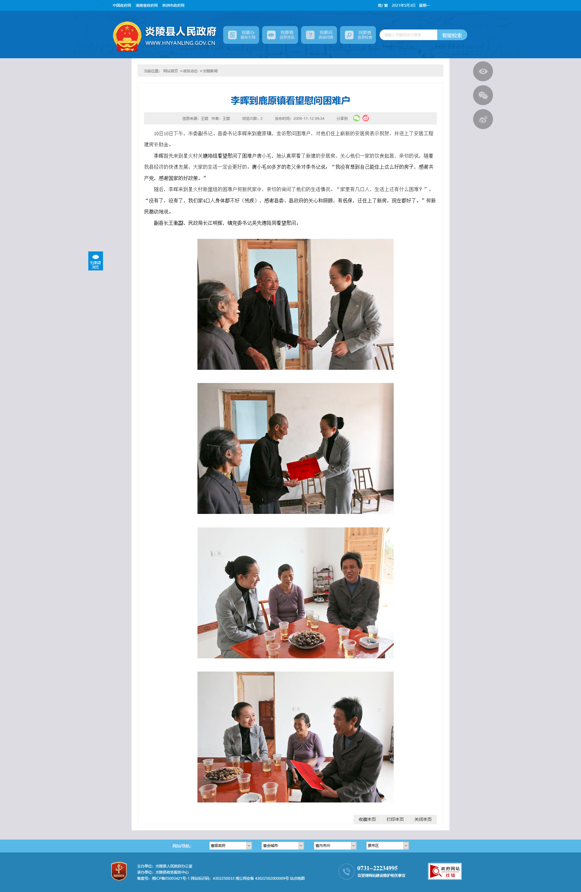 10日10日下午,市委副书记、县委书记李晖来到鹿原镇,走访慰问困难户,对他们住上崭新的安居房表示祝贺,并送上了安居工程建房补助金。