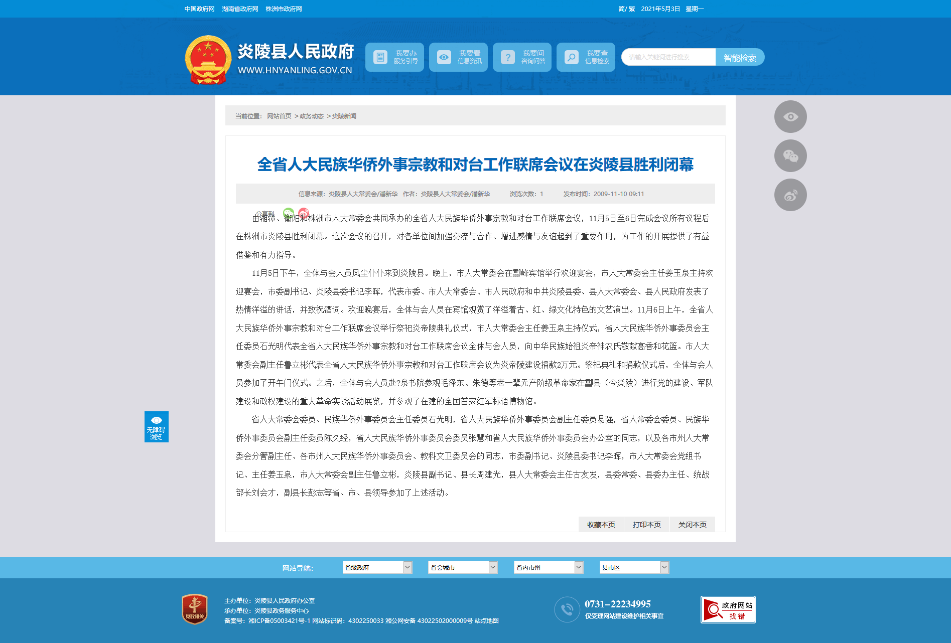 11月5日下午,全体与会人员风尘仆仆来到炎陵县。晚上,市人大常委会在酃峰宾馆举行欢迎宴会,市人大常委会主任姜玉泉主持欢迎宴会,市委副书记、炎陵县委书记李晖,代表市委、市人大常委会、市人民政府和中共炎陵县委、县人大常委会、县人民政府发表了热情洋溢的讲话,并致祝酒词。欢迎晚宴后,全体与会人员在宾馆观赏了洋溢着古、红、绿文化特色的文艺演出。11月6日上午,全省人大民族华侨外事宗教和对台工作联席会议举行祭祀炎帝陵典礼仪式,市人大常委会主任姜玉泉主持仪式,省人大民族华侨外事委员会主任委员石光明代表全省人大民族华侨外事宗教和对台工作联席会议全体与会人员,向中华民族始祖炎帝神农氏敬献高香和花篮。市人大常委会副主任鲁立彬代表全省人大民族华侨外事宗教和对台工作联席会议为炎帝陵建设捐款2万元。祭祀典礼和捐款仪式后,全体与会人员参加了开午门仪式。之后,全体与会人员赴?泉书院参观毛泽东、朱德等老一辈无产阶级革命家在酃县(今炎陵)进行党的建设、军队建设和政权建设的重大革命实践活动展览,并参观了在建的全国首家红军标语博物馆。