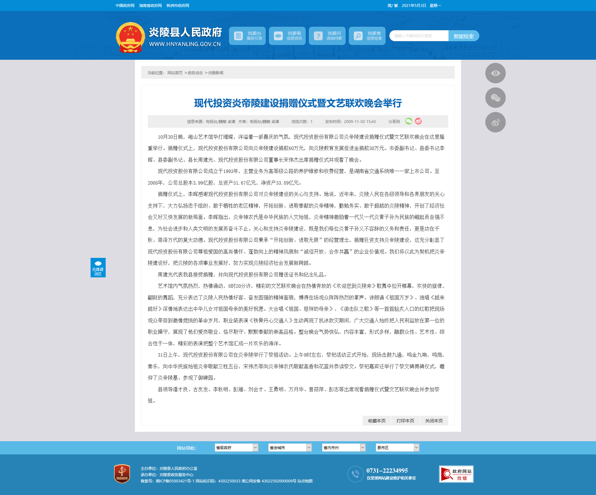 31日上午,现代投资股份有限公司在炎帝陵举行了祭祖活动。上午9时左右,祭祀活动正式开始,现场击鼓九通,鸣金九响,鸣炮,奏乐,向中华民族始祖炎帝敬献三牲五谷,宋伟杰等向炎帝神农氏敬献高香和花篮并恭读祭文。祭祀嘉宾还举行了祭文碑揭碑仪式,瞻仰了炎帝陵墓、参观了御碑园。