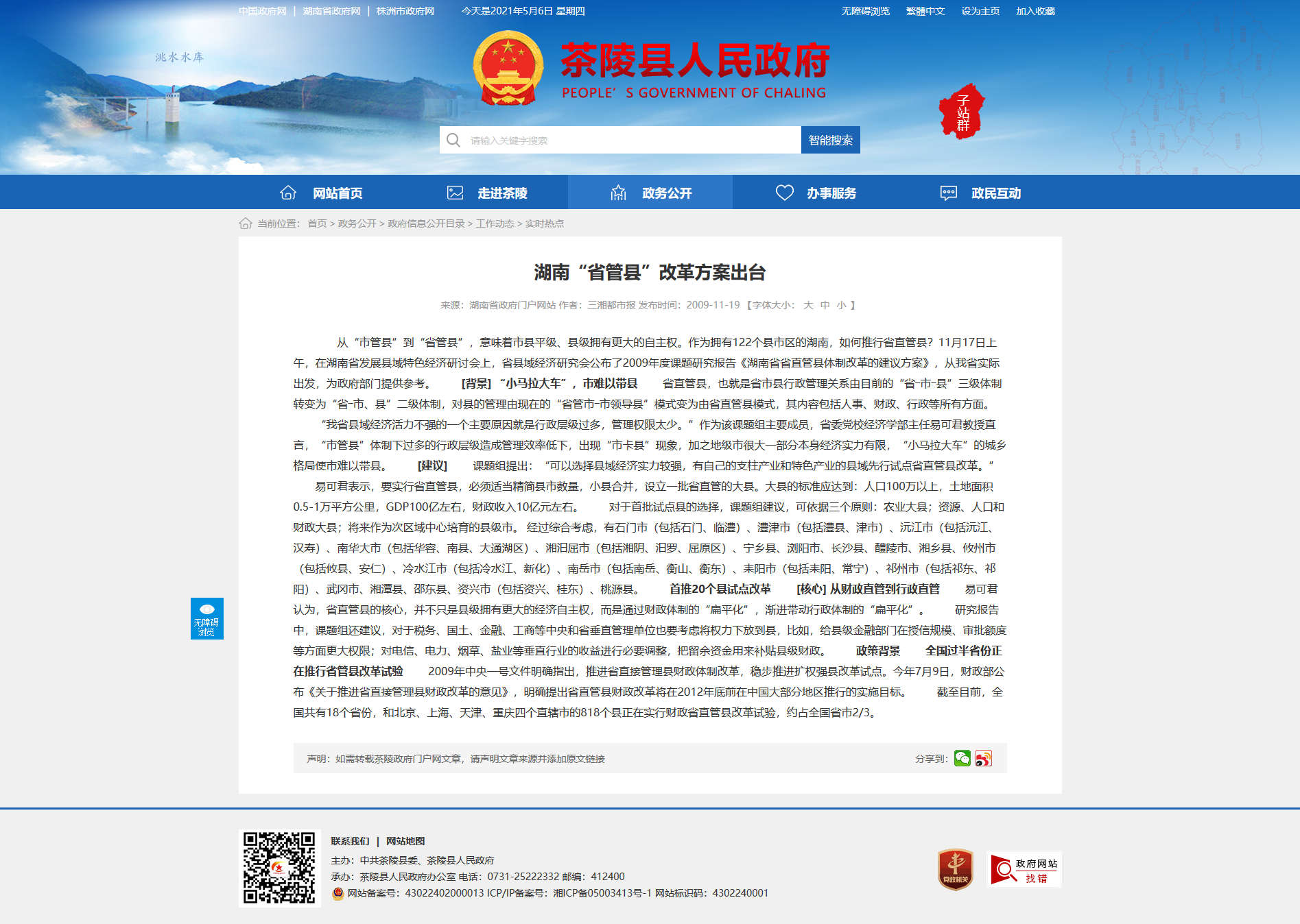 从“市管县”到“省管县”,意味着市县平级、县级拥有更大的自主权。作为拥有122个县市区的湖南,如何推行省直管县?11月17日上午,在湖南省发展县域特色经济研讨会上,省县域经济研究会公布了2009年度课题研究报告《湖南省省直管县体制改革的建议方案》,从我省实际出发,为政府部门提供参考。 [背景] “小马拉大车”,市难以带县 省直管县,也就是省市县行政管理关系由目前的“省―市―县”三级体制转变为“省―市、县”二级体制,对县的管理由现在的“省管市―市领导县”模式变为由省直管县模式,其内容包括人事、财政、行政等所有方面。 “我省县域经济活力不强的一个主要原因就是行政层级过多,管理权限太少。”作为该课题组主要成员,省委党校经济学部主任易可君教授直言,“市管县”体制下过多的行政层级造成管理效率低下,出现“市卡县”现象,加之地级市很大一部分本身经济实力有限,“小马拉大车”的城乡格局使市难以带县。 [建议] 课题组提出:“可以选择县域经济实力较强,有自己的支柱产业和特色产业的县域先行试点省直管县改革。” 易可君表示,要实行省直管县,必须适当精简县市数量,小县合并,设立一批省直管的大县。大县的标准应达到:人口100万以上,土地面积0.5-1万平方公里,GDP100亿左右,财政收入10亿元左右。 对于首批试点县的选择,课题组建议,可依据三个原则:农业大县;资源、人口和财政大县;将来作为次区域中心培育的县级市。 经过综合考虑,有石门市(包括石门、临澧)、澧津市(包括澧县、津市)、沅江市(包括沅江、汉寿)、南华大市(包括华容、南县、大通湖区)、湘汨屈市(包括湘阴、汨罗、屈原区)、宁乡县、浏阳市、长沙县、醴陵市、湘乡县、攸州市(包括攸县、安仁)、冷水江市(包括冷水江、新化)、南岳市(包括南岳、衡山、衡东)、耒阳市(包括耒阳、常宁)、祁州市(包括祁东、祁阳)、武冈市、湘潭县、邵东县、资兴市(包括资兴、桂东)、桃源县。 首推20个县试点改革 [核心] 从财政直管到行政直管 易可君认为,省直管县的核心,并不只是县级拥有更大的经济自主权,而是通过财政体制的“扁平化”,渐进带动行政体制的“扁平化”。 研究报告中,课题组还建议,对于税务、国土、金融、工商等中央和省垂直管理单位也要考虑将权力下放到县,比如,给县级金融部门在授信规模、审批额度等方面更大权限;对电信、电力、烟草、盐业等垂直行业的收益进行必要调整,把留余资金用来补贴县级财政。 政策背景 全国过半省份正在推行省管县改革试验 2009年中央一号文件明确指出,推进省直接管理县财政体制改革,稳步推进扩权强县改革试点。今年7月9日,财政部公布《关于推进省直接管理县财政改革的意见》,明确提出省直管县财政改革将在2012年底前在中国大部分地区推行的实施目标。 截至目前,全国共有18个省份,和北京、上海、天津、重庆四个直辖市的818个县正在实行财政省直管县改革试验,约占全国省市2/3。