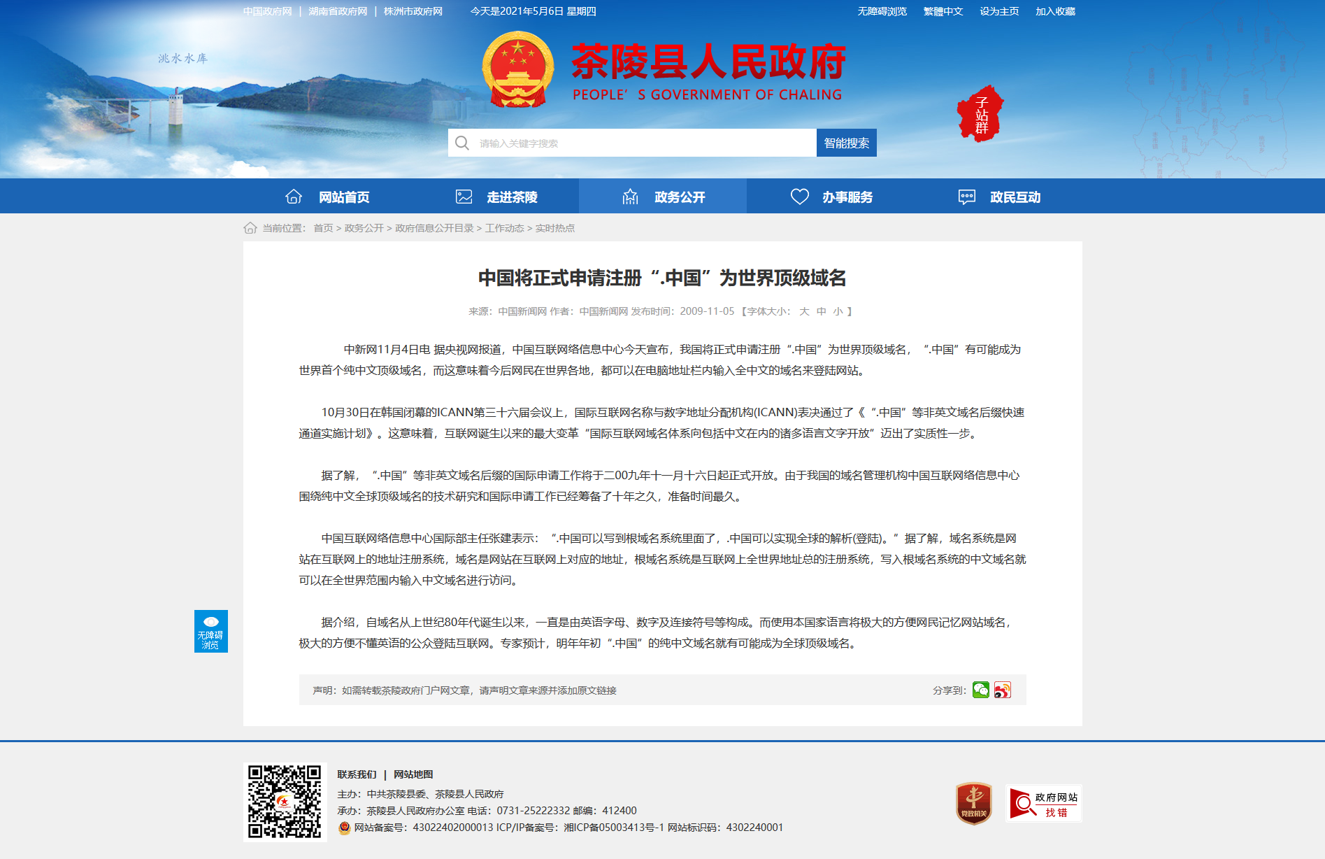 中国互联网络信息中心国际部主任张建表示:“.中国可以写到根域名系统里面了,.中国可以实现全球的解析(登陆)。”据了解,域名系统是网站在互联网上的地址注册系统,域名是网站在互联网上对应的地址,根域名系统是互联网上全世界地址总的注册系统,写入根域名系统的中文域名就可以在全世界范围内输入中文域名进行访问。