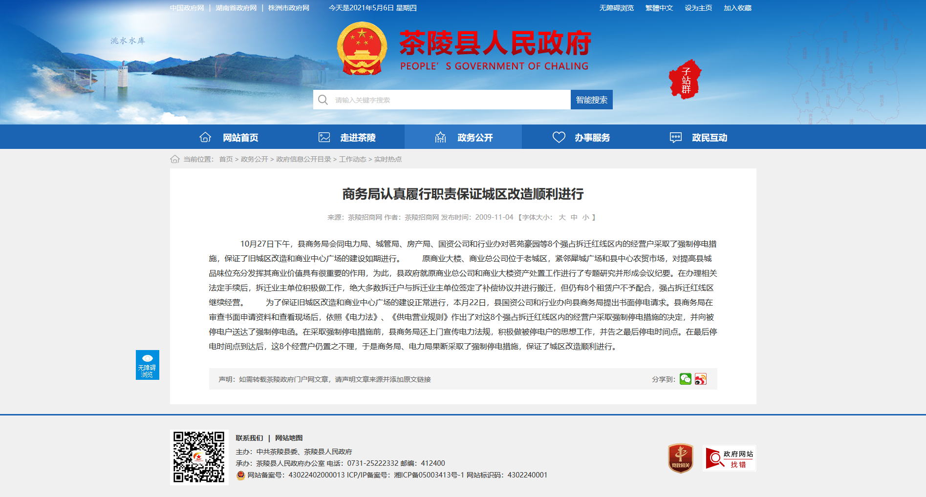 10月27日下午,县商务局会同电力局、城管局、房产局、国资公司和行业办对茗苑豪园等8个强占拆迁红线区内的经营户采取了强制停电措施,保证了旧城区改造和商业中心广场的建设如期进行。 原商业大楼、商业总公司位于老城区,紧邻犀城广场和县中心农贸市场,对提高县城品味位充分发挥其商业价值具有很重要的作用,为此,县政府就原商业总公司和商业大楼资产处置工作进行了专题研究并形成会议纪要。在办理相关法定手续后,拆迁业主单位积极做工作,绝大多数拆迁户与拆迁业主单位签定了补偿协议并进行搬迁,但仍有8个租赁户不予配合,强占拆迁红线区继续经营。 为了保证旧城区改造和商业中心广场的建设正常进行,本月22日,县国资公司和行业办向县商务局提出书面停电请求。县商务局在审查书面申请资料和查看现场后,依照《电力法》、《供电营业规则》作出了对这8个强占拆迁红线区内的经营户采取强制停电措施的决定,并向被停电户送达了强制停电函。在采取强制停电措施前,县商务局还上门宣传电力法规,积极做被停电户的思想工作,并告之最后停电时间点。在最后停电时间点到达后,这8个经营户仍置之不理,于是商务局、电力局果断采取了强制停电措施,保证了城区改造顺利进行。