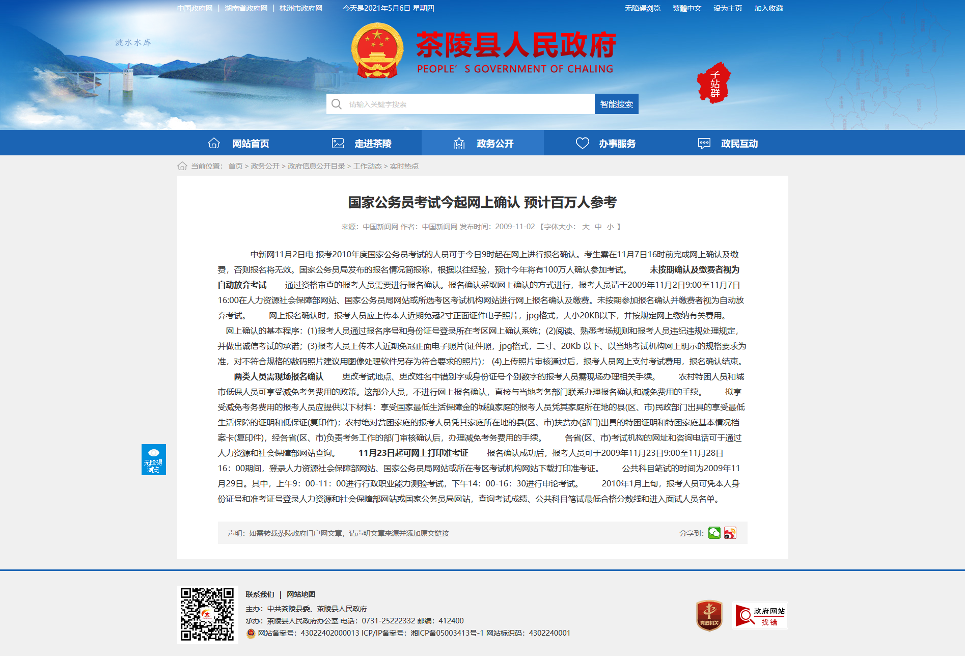 中新网11月2日电 报考2010年度国家公务员考试的人员可于今日9时起在网上进行报名确认。考生需在11月7日16时前完成网上确认及缴费,否则报名将无效。国家公务员局发布的报名情况简报称,根据以往经验,预计今年将有100万人确认参加考试。 未按期确认及缴费者视为自动放弃考试 通过资格审查的报考人员需要进行报名确认。报名确认采取网上确认的方式进行,报考人员请于2009年11月2日9:00至11月7日16:00在人力资源社会保障部网站、国家公务员局网站或所选考区考试机构网站进行网上报名确认及缴费。未按期参加报名确认并缴费者视为自动放弃考试。 网上报名确认时,报考人员应上传本人近期免冠2寸正面证件电子照片,jpg格式,大小20KB以下,并按规定网上缴纳有关费用。 网上确认的基本程序:(1)报考人员通过报名序号和身份证号登录所在考区网上确认系统;(2)阅读、熟悉考场规则和报考人员违纪违规处理规定,并做出诚信考试的承诺;(3)报考人员上传本人近期免冠正面电子照片(证件照,jpg格式,二寸、20Kb 以下、以当地考试机构网上明示的规格要求为准,对不符合规格的数码照片建议用图像处理软件另存为符合要求的照片); (4)上传照片审核通过后,报考人员网上支付考试费用,报名确认结束。 两类人员需现场报名确认 更改考试地点、更改姓名中错别字或身份证号个别数字的报考人员需现场办理相关手续。 农村特困人员和城市低保人员可享受减免考务费用的政策。这部分人员,不进行网上报名确认,直接与当地考务部门联系办理报名确认和减免费用的手续。 拟享受减免考务费用的报考人员应提供以下材料:享受国家最低生活保障金的城镇家庭的报考人员凭其家庭所在地的县(区、市)民政部门出具的享受最低生活保障的证明和低保证(复印件);农村绝对贫困家庭的报考人员凭其家庭所在地的县(区、市)扶贫办(部门)出具的特困证明和特困家庭基本情况档案卡(复印件),经各省(区、市)负责考务工作的部门审核确认后,办理减免考务费用的手续。 各省(区、市)考试机构的网址和咨询电话可于通过人力资源和社会保障部网站查询。 11月23日起可网上打印准考证 报名确认成功后,报考人员可于2009年11月23日9:00至11月28日16:00期间,登录人力资源社会保障部网站、国家公务员局网站或所在考区考试机构网站下载打印准考证。 公共科目笔试的时间为2009年11月29日。其中,上午9:00-11:00进行行政职业能力测验考试,下午14:00-16:30进行申论考试。 2010年1月上旬,报考人员可凭本人身份证号和准考证号登录人力资源和社会保障部网站或国家公务员局网站,查询考试成绩、公共科目笔试最低合格分数线和进入面试人员名单。