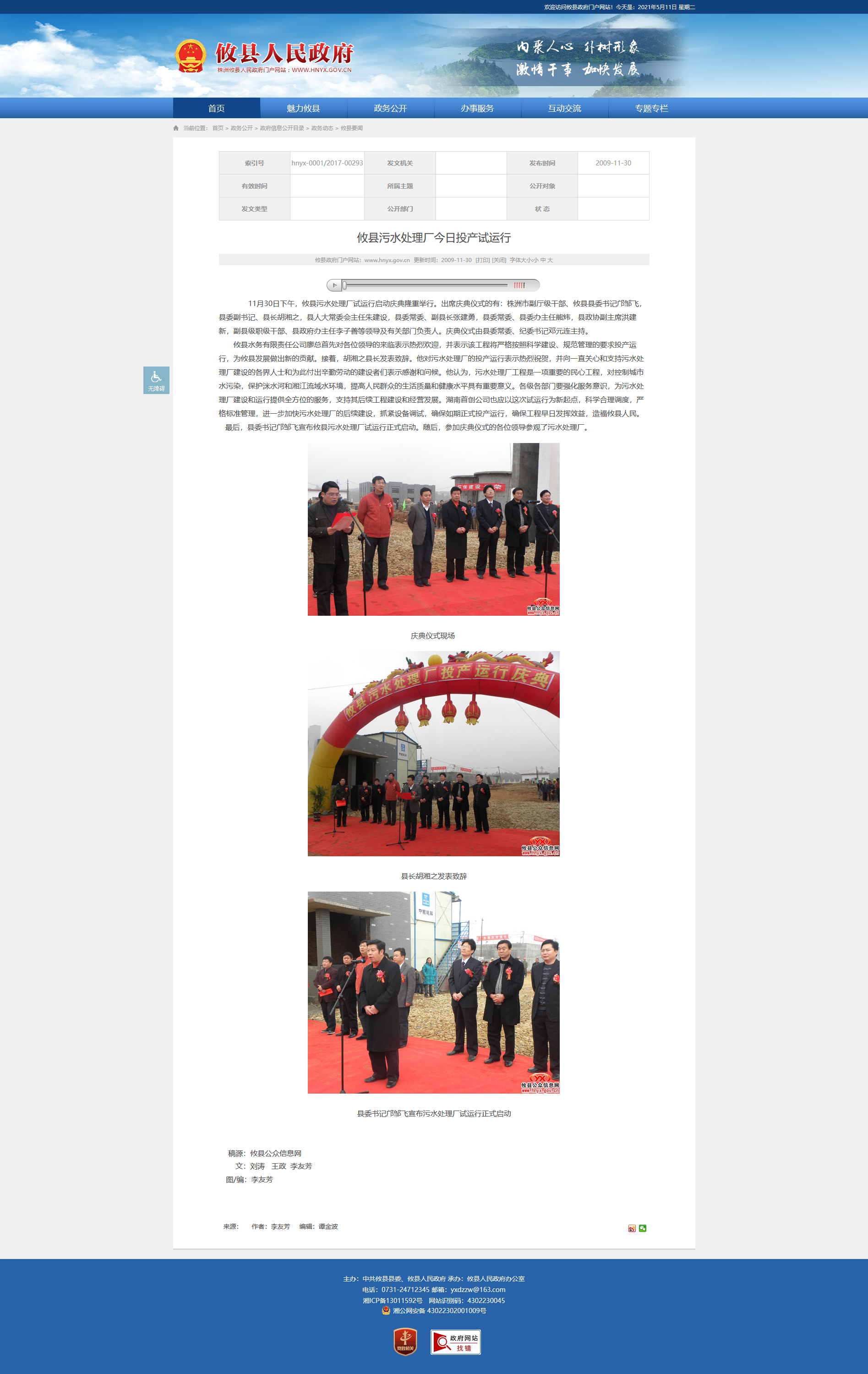 攸县水务有限责任公司廖总首先对各位领导的来临表示热烈欢迎,并表示该工程将严格按照科学建设、规范管理的要求投产运行,为攸县发展做出新的贡献。接着,胡湘之县长发表致辞。他对污水处理厂的投产运行表示热烈祝贺,并向一直关心和支持污水处理厂建设的各界人士和为此付出辛勤劳动的建设者们表示感谢和问候。他认为,污水处理厂工程是一项重要的民心工程,对控制城市水污染,保护洣水河和湘江流域水环境,提高人民群众的生活质量和健康水平具有重要意义。各级各部门要强化服务意识,为污水处理厂建设和运行提供全方位的服务,支持其后续工程建设和经营发展。湖南首创公司也应以这次试运行为新起点,科学合理调度,严格标准管理,进一步加快污水处理厂的后续建设,抓紧设备调试,确保如期正式投产运行,确保工程早日发挥效益,造福攸县人民。