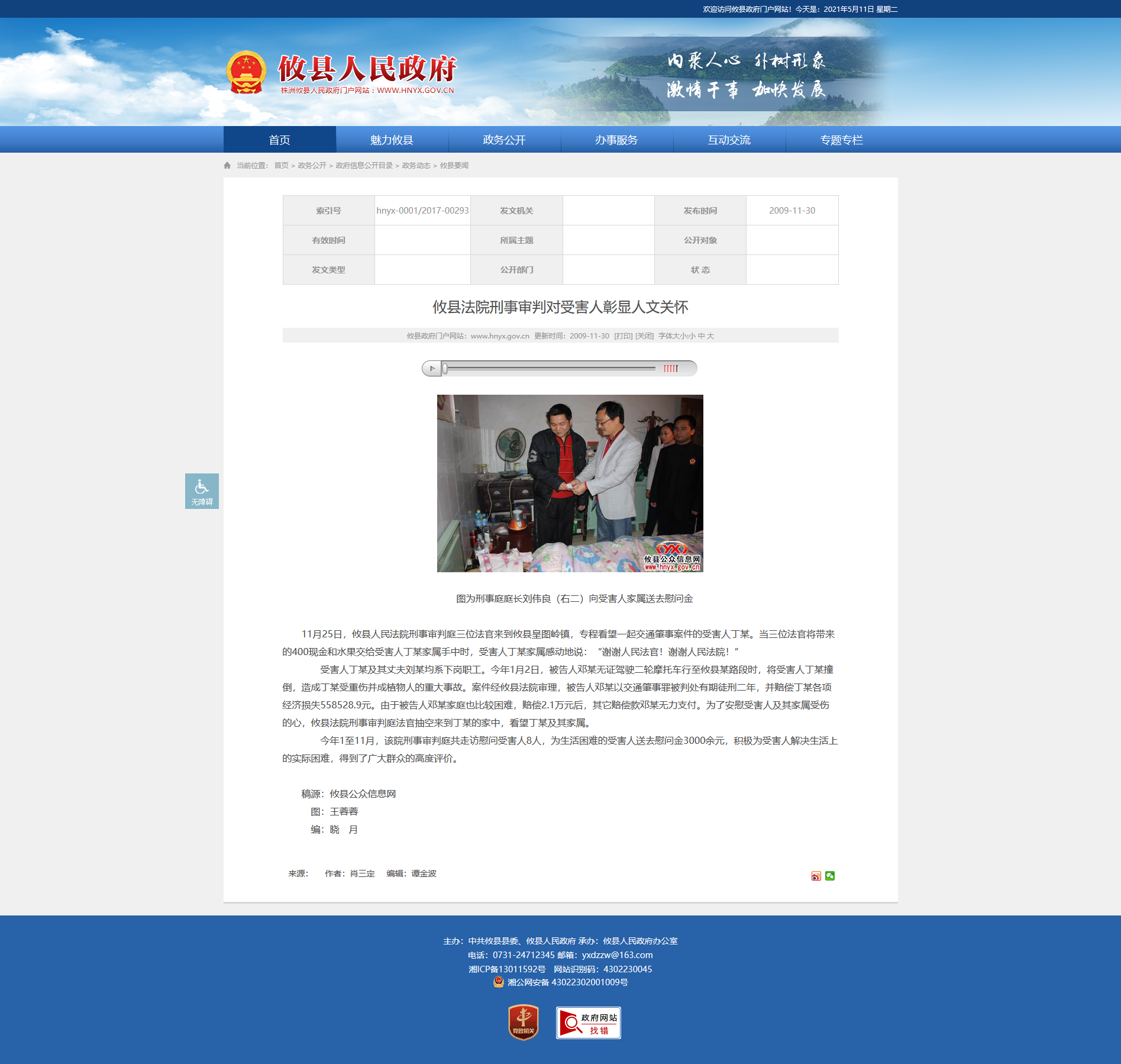 11月25日,攸县人民法院刑事审判庭三位法官来到攸县皇图岭镇,专程看望一起交通肇事案件的受害人丁某。当三位法官将带来的400现金和水果交给受害人丁某家属手中时,受害人丁某家属感动地说:“谢谢人民法官!谢谢人民法院!”