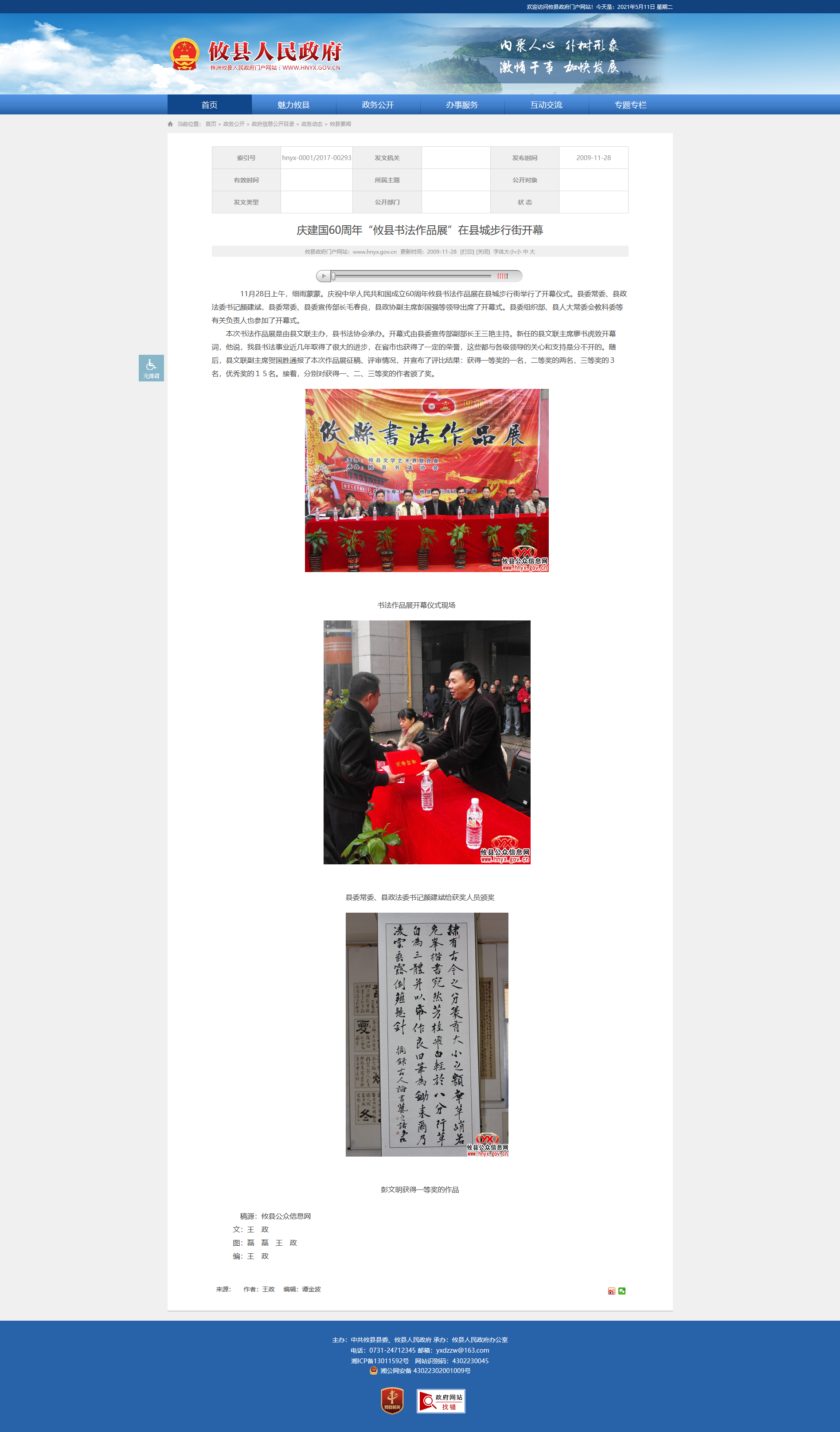 11月28日上午,细雨蒙蒙。庆祝中华人民共和国成立60周年攸县书法作品展在县城步行街举行了开幕仪式。县委常委、县政法委书记颜建斌,县委常委、县委宣传部长毛春良,县政协副主席彭国强等领导出席了开幕式。县委组织部、县人大常委会教科委等有关负责人也参加了开幕式。