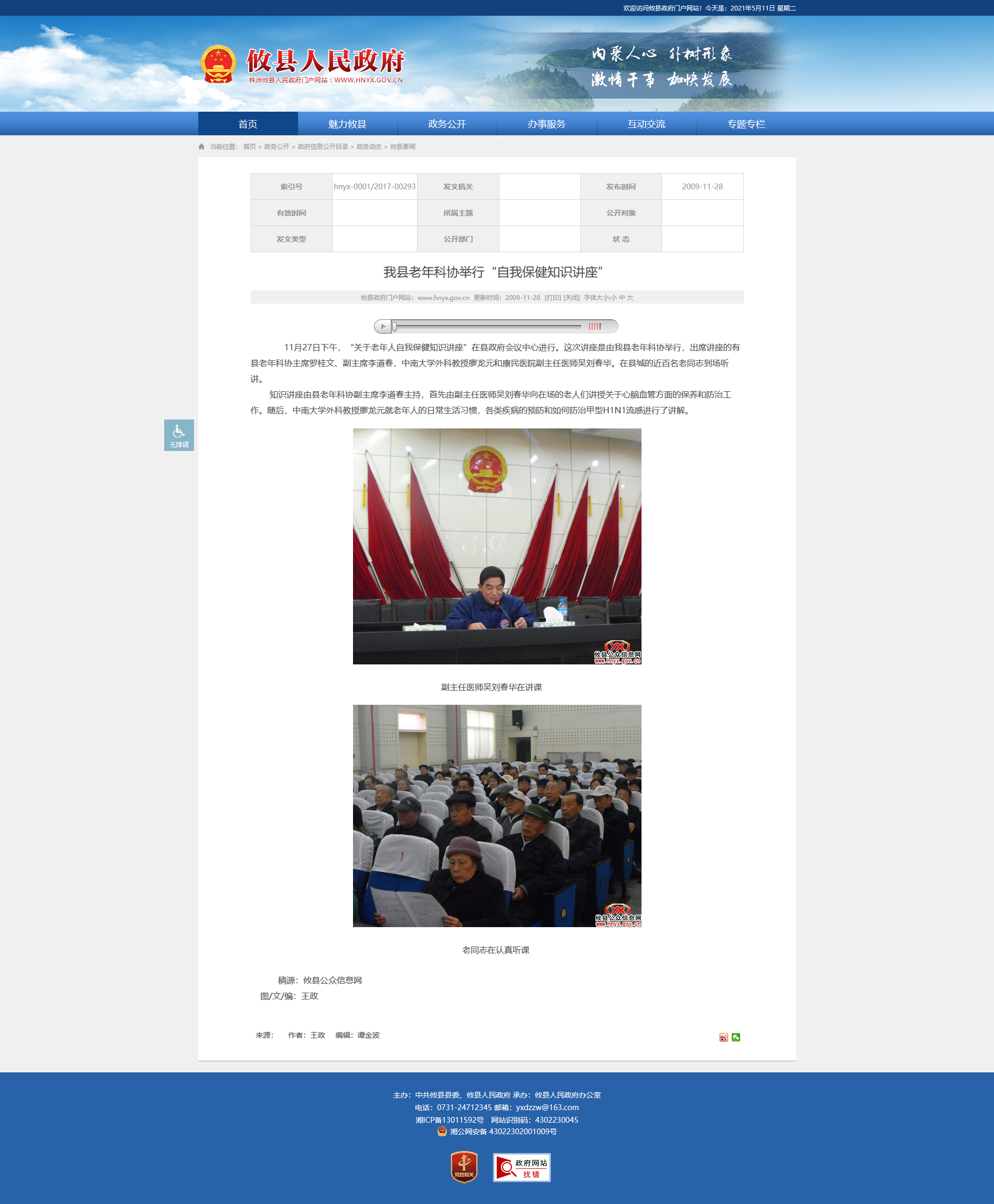 11月27日下午,“关于老年人自我保健知识讲座”在县政府会议中心进行。这次讲座是由我县老年科协举行,出席讲座的有县老年科协主席罗桂文、副主席李道春,中南大学外科教授廖龙元和康民医院副主任医师吴刘春华。在县城的近百名老同志到场听讲。