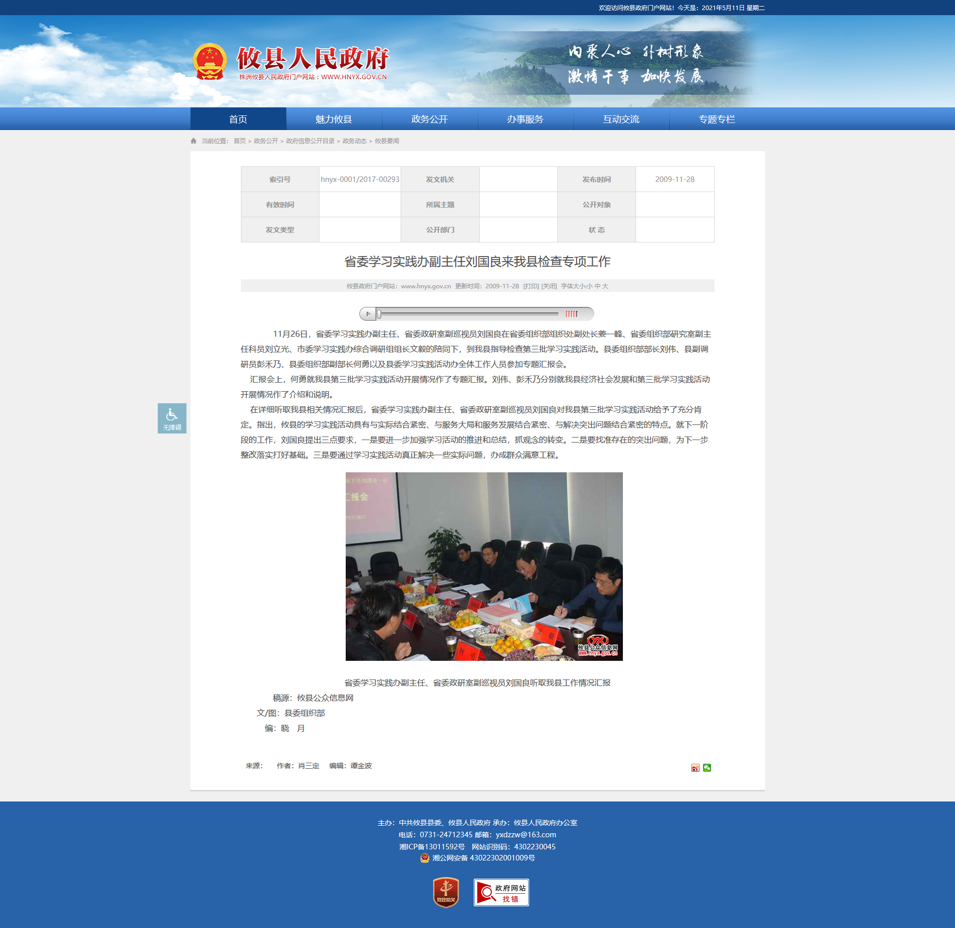 11月26日,省委学习实践办副主任、省委政研室副巡视员刘国良在省委组织部组织处副处长姜一峰、省委组织部研究室副主任科员刘立光、市委学习实践办综合调研组组长文毅的陪同下,到我县指导检查第三批学习实践活动。县委组织部部长刘伟、县副调研员彭禾乃、县委组织部副部长何勇以及县委学习实践活动办全体工作人员参加专题汇报会。