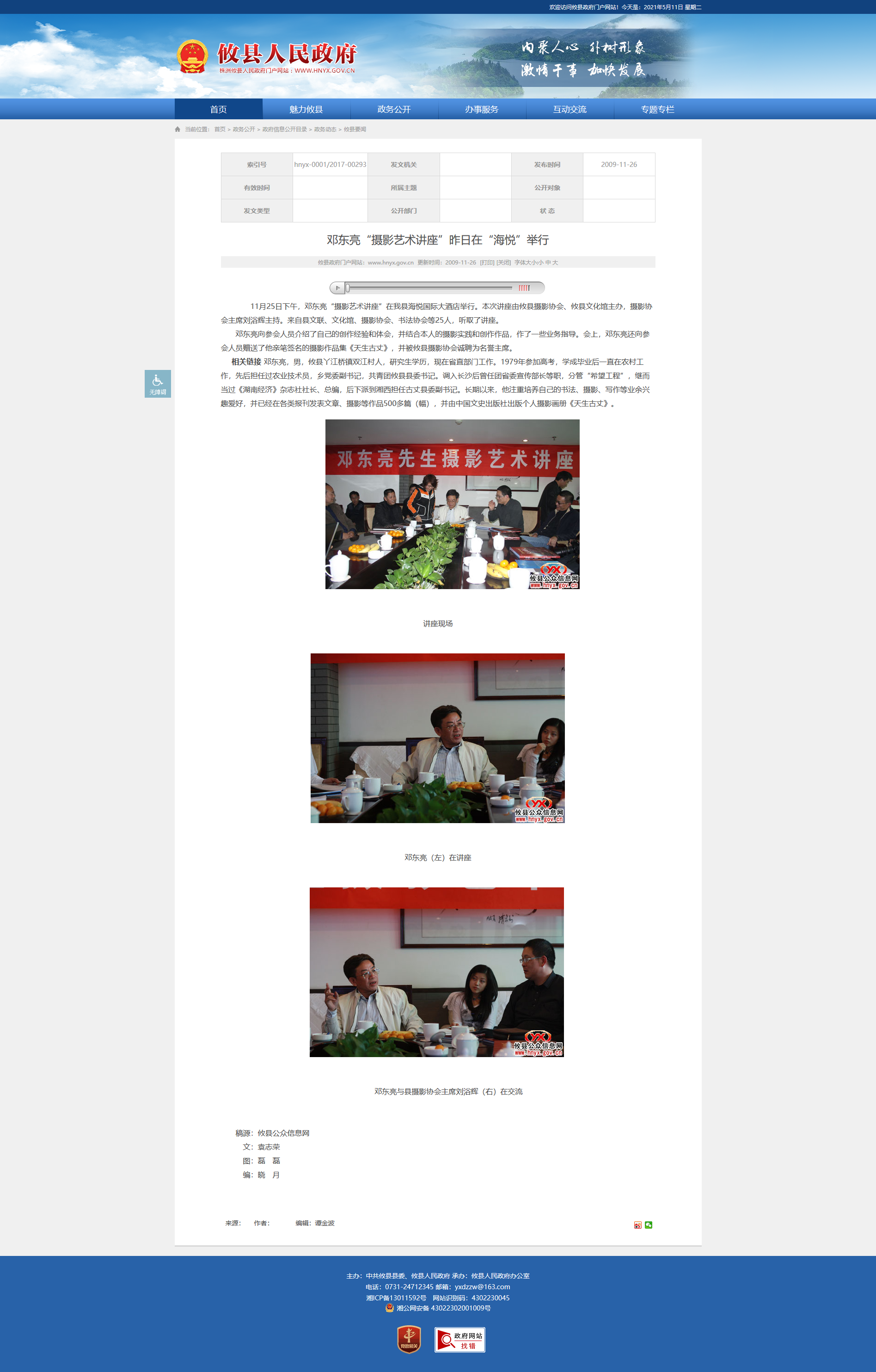 11月25日下午,邓东亮“摄影艺术讲座”在我县海悦国际大酒店举行。本次讲座由攸县摄影协会、攸县文化馆主办,摄影协会主席刘浴辉主持。来自县文联、文化馆、摄影协会、书法协会等25人,听取了讲座。
