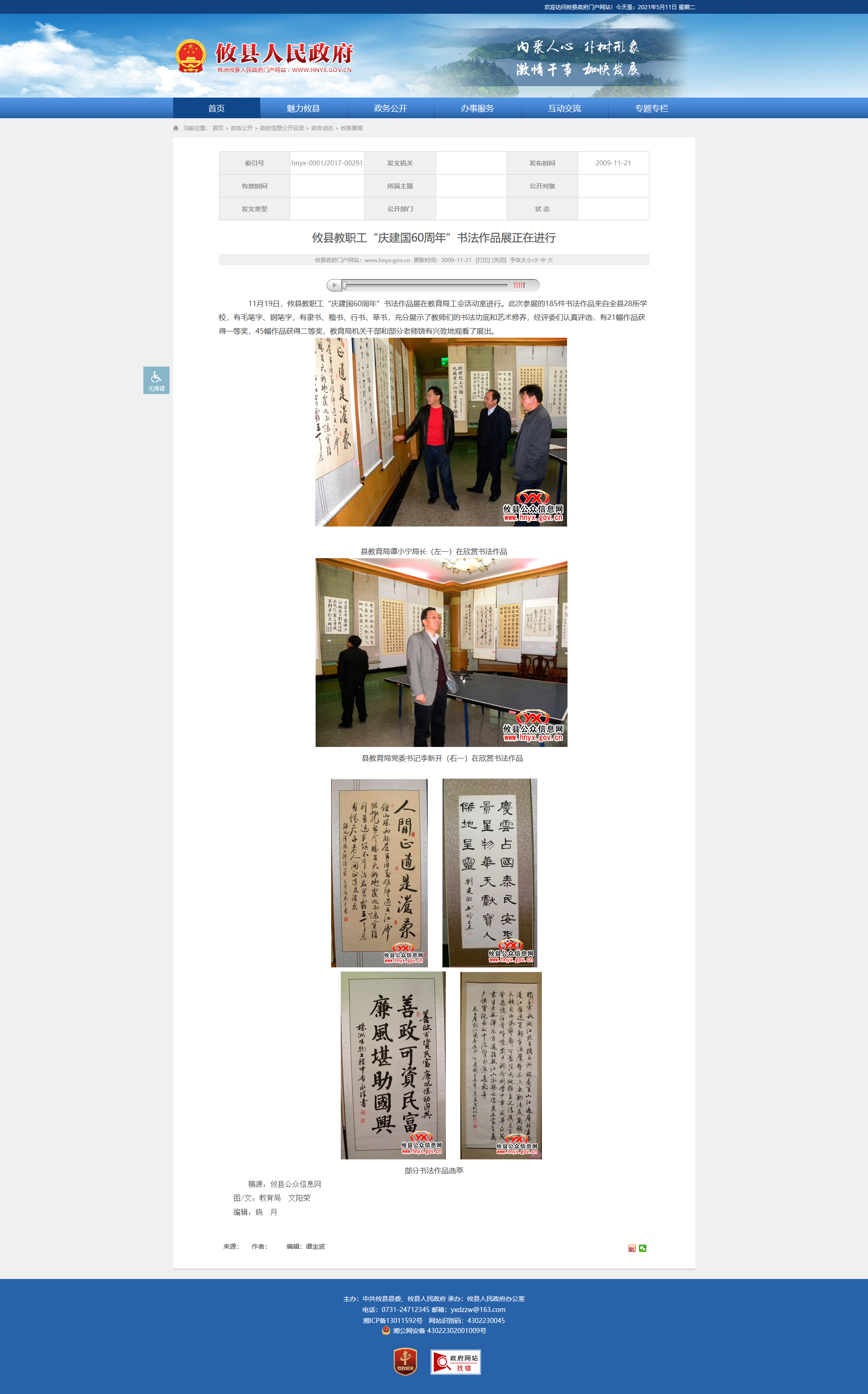 11月19日,攸县教职工“庆建国60周年”书法作品展在教育局工会活动室进行。此次参展的185件书法作品来自全县28所学校,有毛笔字、钢笔字,有隶书、楷书、行书、草书,充分展示了教师们的书法功底和艺术修养,经评委们认真评选,有21幅作品获得一等奖,45幅作品获得二等奖,教育局机关干部和部分老师饶有兴致地观看了展出。
