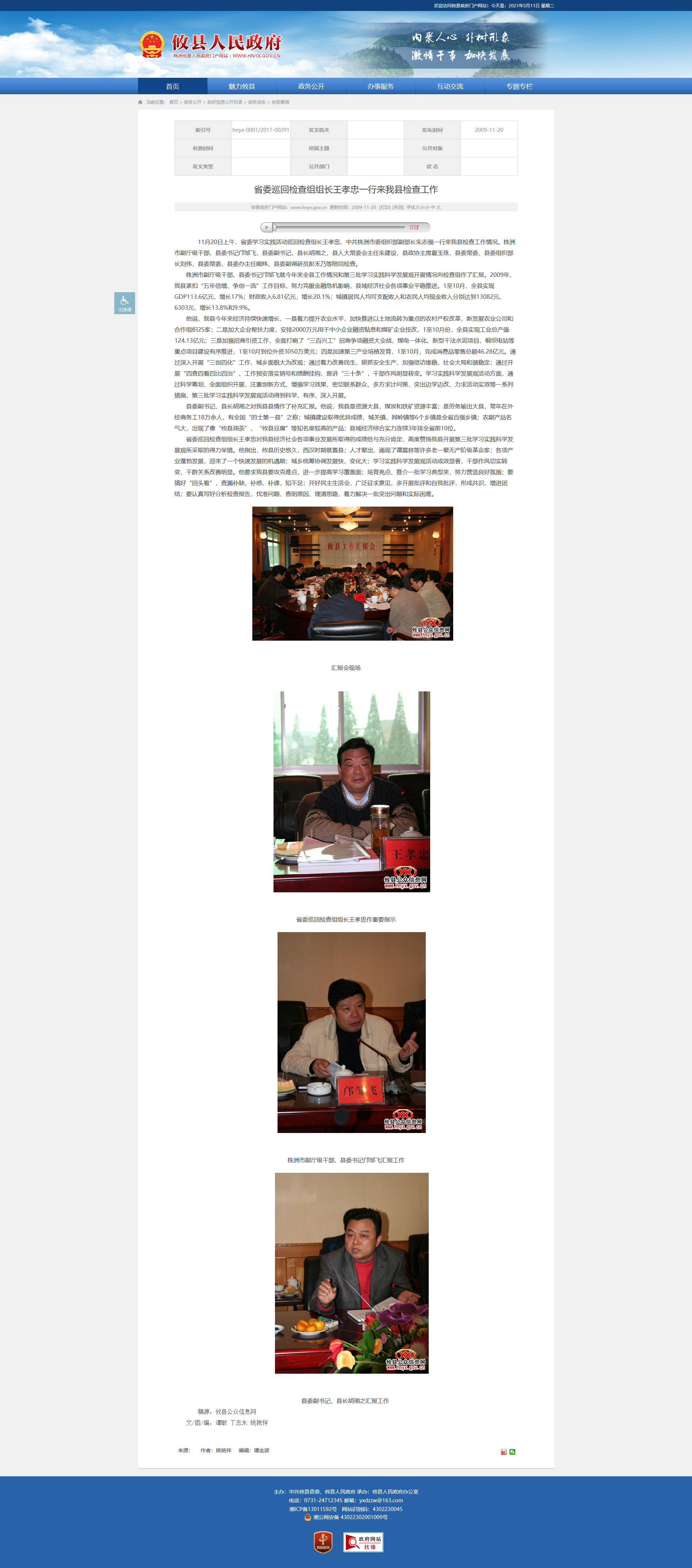 11月20日上午,省委学习实践活动巡回检查组长王孝忠、中共株洲市委组织部副部长朱志强一行来我县检查工作情况。株洲市副厅级干部、县委书记邝邹飞,县委副书记、县长胡湘之,县人大常委会主任朱建设,县政协主席夏玉珠,县委常委、县委组织部长刘伟,县委常委、县委办主任熊炜、县委副调研员彭禾乃等陪同检查。