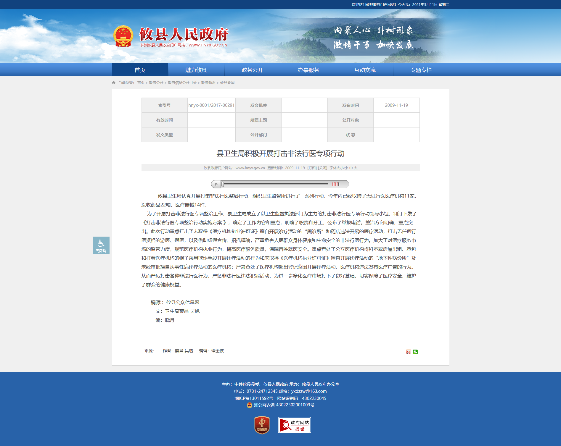 攸县卫生局认真开展打击非法行医整治行动,组织卫生监督所进行了一系列行动,今年内已经取缔了无证行医医疗机构11家,没收药品22箱、医疗器械14件。
