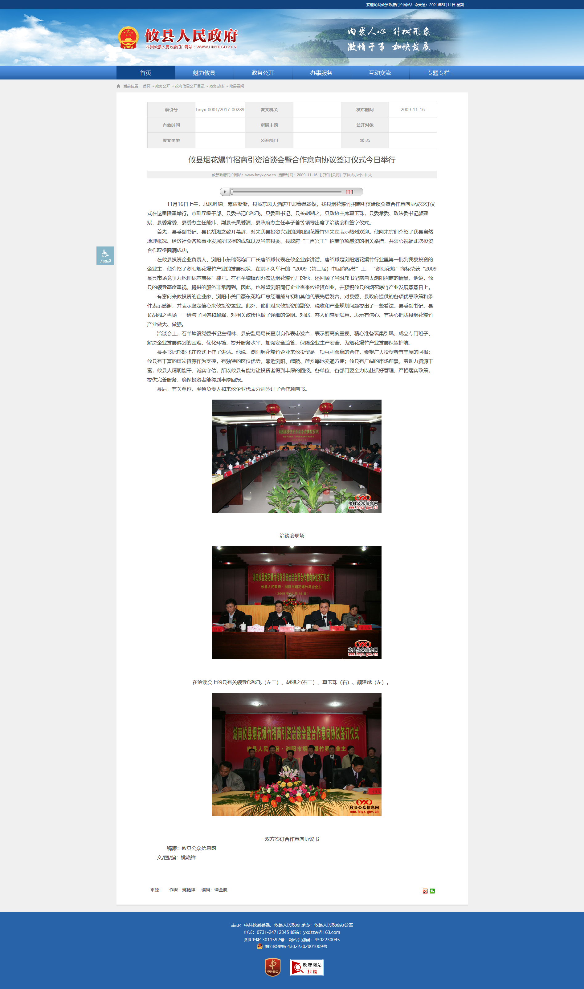 县委书记邝邹飞在仪式上作了讲话。他说,浏阳烟花爆竹企业来攸投资是一项互利双赢的合作,希望广大投资者有丰厚的回报;攸县有丰富的煤炭资源作为支撑,有独特的区位优势,靠近浏阳、醴陵、萍乡等地交通方便;攸县有广阔的市场前景,劳动力资源丰富,攸县人精明能干、诚实守信,所以攸县有能力让投资者得到丰厚的回报。各单位、各部门要全力以赴抓好管理,严格落实政策,提供完善服务,确保投资者能得到丰厚回报。