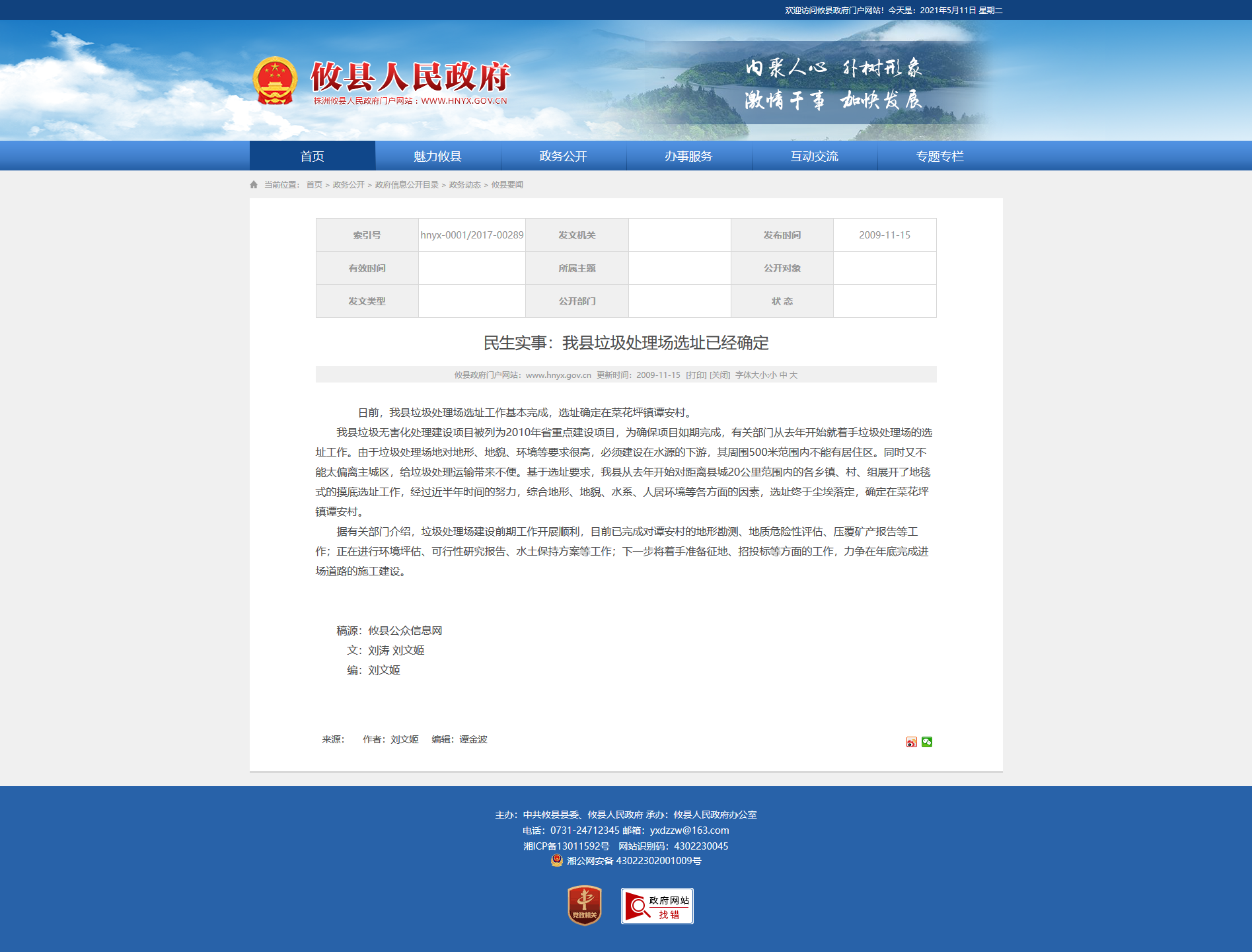 日前,我县垃圾处理场选址工作基本完成,选址确定在菜花坪镇谭安村。