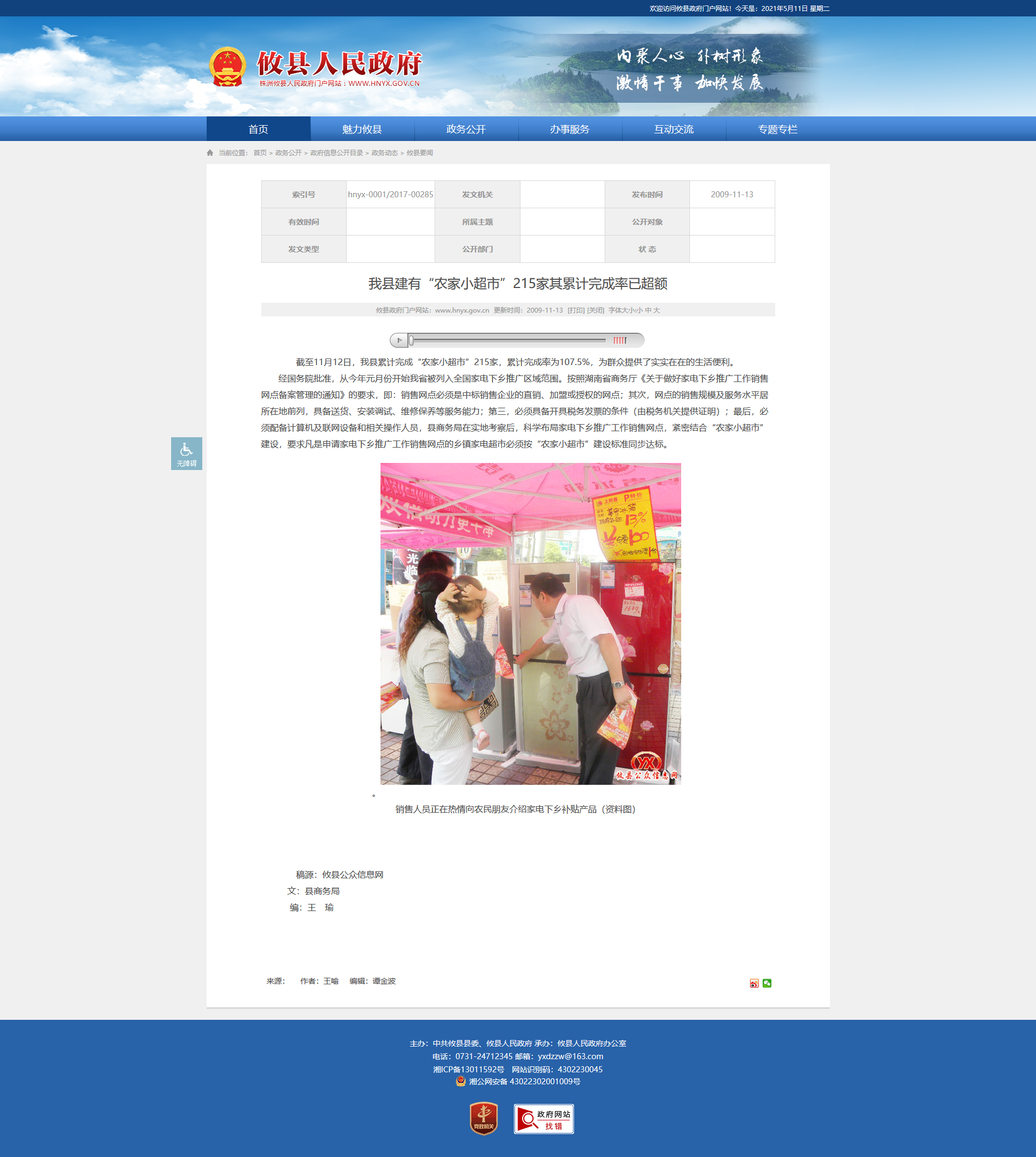 经国务院批准,从今年元月份开始我省被列入全国家电下乡推广区域范围。按照湖南省商务厅《关于做好家电下乡推广工作销售网点备案管理的通知》的要求,即:销售网点必须是中标销售企业的直销、加盟或授权的网点;其次,网点的销售规模及服务水平居所在地前列,具备送货、安装调试、维修保养等服务能力;第三,必须具备开具税务发票的条件(由税务机关提供证明);最后,必须配备计算机及联网设备和相关操作人员,县商务局在实地考察后,科学布局家电下乡推广工作销售网点,紧密结合“农家小超市”建设,要求凡是申请家电下乡推广工作销售网点的乡镇家电超市必须按“农家小超市”建设标准同步达标。